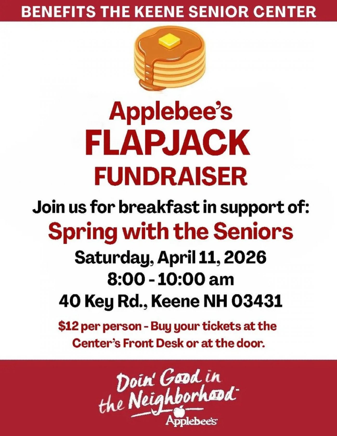 Join us for breakfast in support of the Spring with the Seniors, Saturday, April 11th, 2026, 8:00AM-10:00AM at Applebee's Grill and Bar, 40 Key Road, Keene, NH. Tickets are $12.00 per person. You can buy your tickets at the Center's Front Desk or at the door.