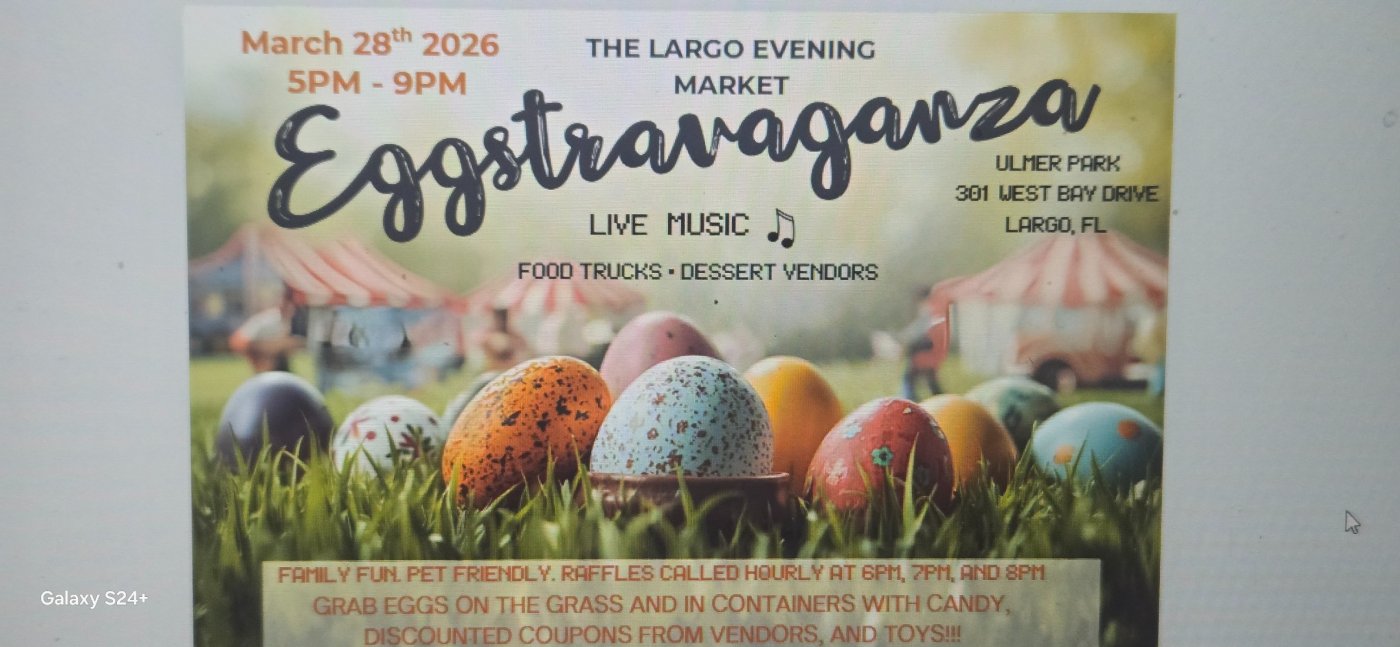 Ulmer Park, 301 West Bay Dr. Largo, Fl. 5pm to 9pm. LIVE MUSIC with Liz Pennock and Dr. Blues, FOOD TRUCKS Lithuanian Food Truck, Annie Get Your Bun, and Clementine Cruiser (Ice Cream)., PRODUCE VENDOR and dessert vendors! Grab eggs on the grass and OPEN them. You will find coupons in them from all the vendors, candy, or a toy! Buy from a vendor and receive a RAFFLE ticket. Bring it to the information table for a chance to win a RAFFLE. RAFFLES called at 6pm, 7pm, and 8pm! Pet Friendly