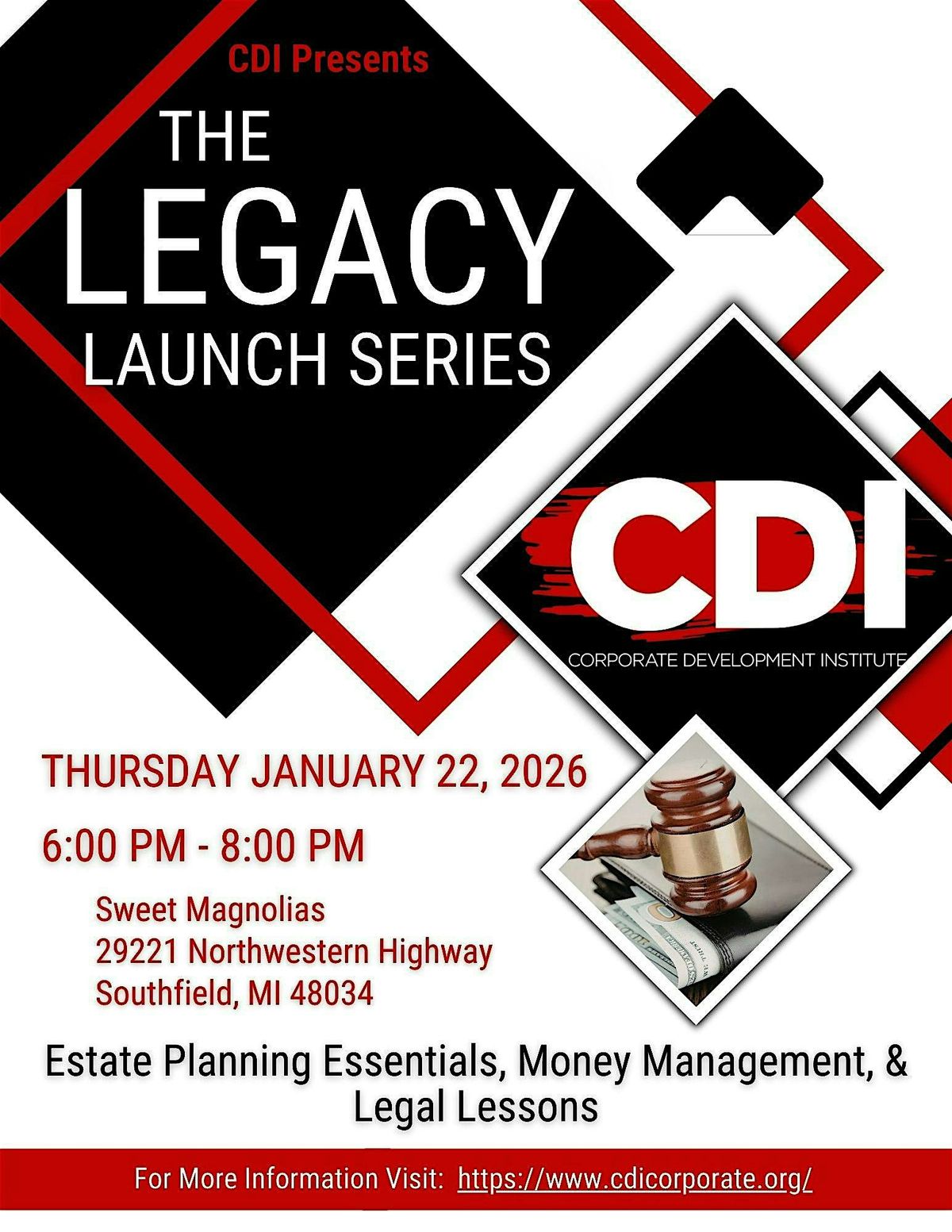 This kickoff event launches The Legacy Launch Series, offering beginner-friendly guidance on estate planning, money management, and essential legal concepts. Designed to empower participants with foundational knowledge and practical tools, this event will show you how to protect your well-being, safeguard your family’s future, and prepare for both expected and unexpected life events. Hosted by CDI and Ricks & Associates.