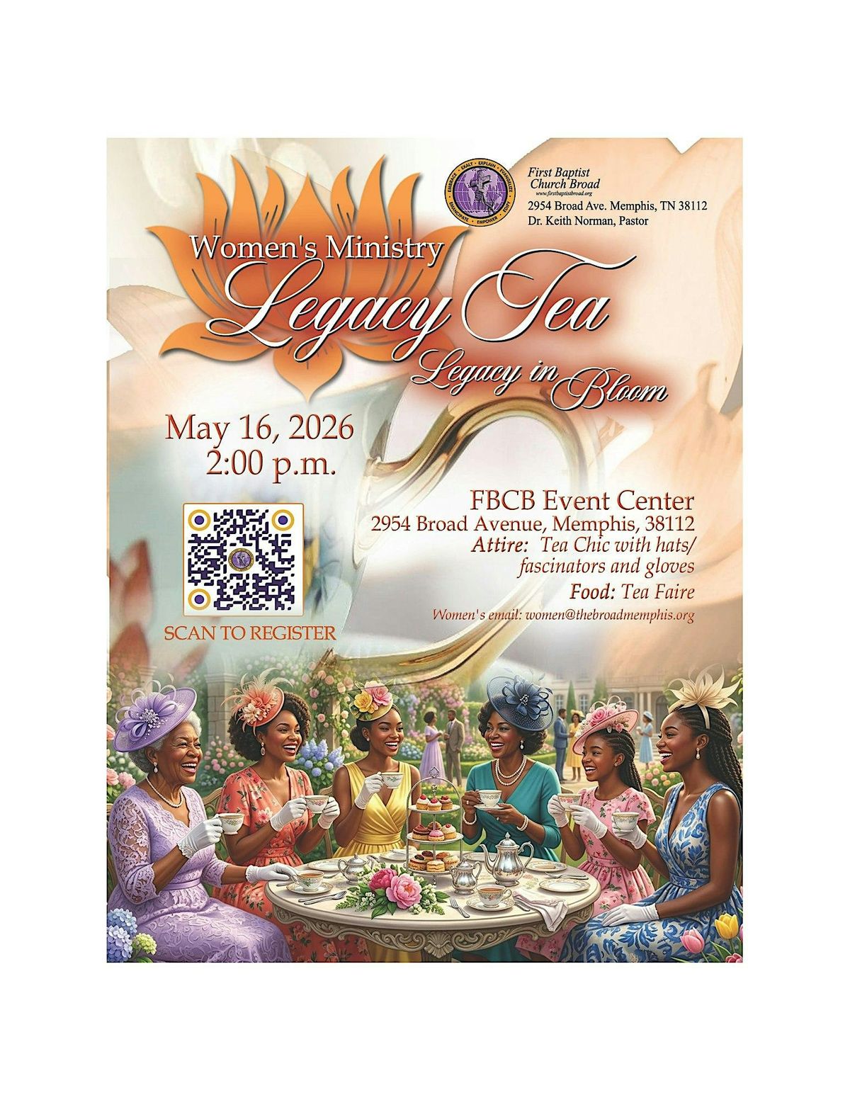 Our theme this year is "Legacy in Bloom," a celebration of the faith and beauty passed down through our community. We invite all women, men, and youth (ages 10 and up) to join us for an afternoon of soulful fellowship and delicious "Tea Faire."