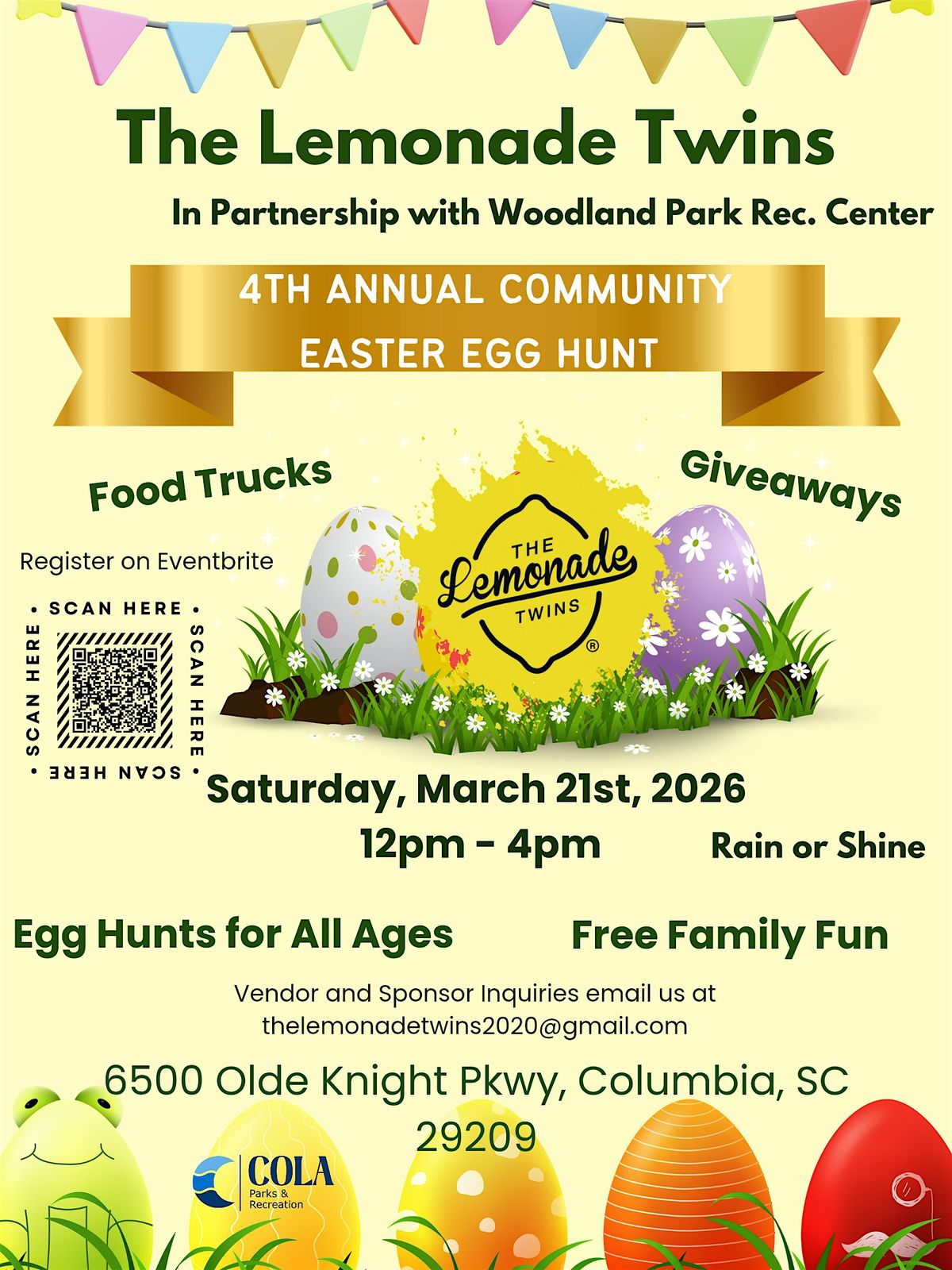 Welcome to The Lemonade Twins 4th Annual Community Easter Egg Hunt! Join us at Woodland Park Rec Center 6500 Olde Knight Pkwy on March 21, 2026 at 12:00 PM (Eastern Time) for a day of fun and excitement. Bring your family and friends for a memorable Easter celebration filled with egg hunts, games, and more. Don't forget to bring your Easter baskets to collect all the eggs! See you there!