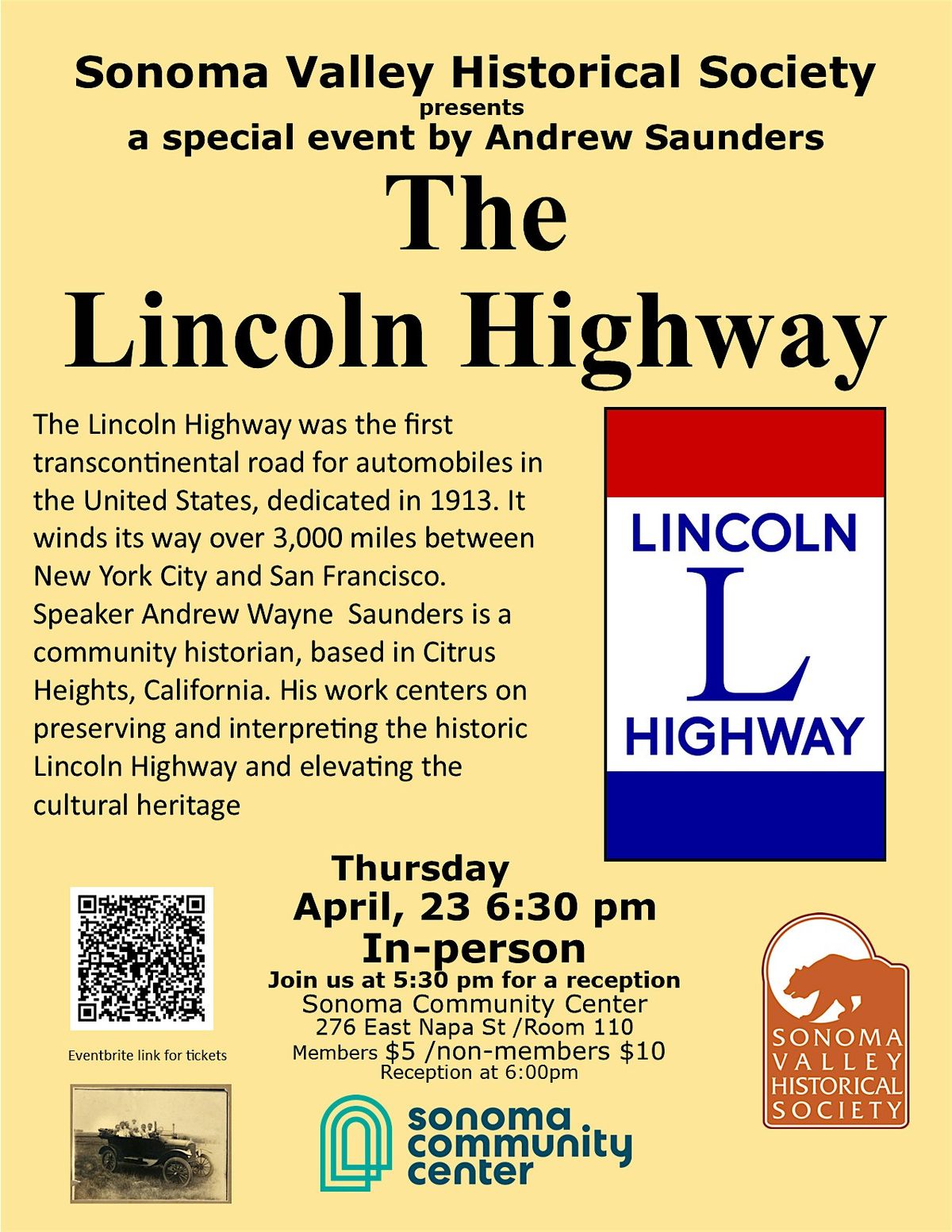 The Sonoma Valley Historical Society presentation 'The Lincoln Highway' was the first transcontinental road for automobiles in the United States, dedicated in 1913. It winds its way over 3,000 miles between New York City and San Francisco. Speaker Andrew Wayne Saunders is a community historian, based in Citrus Heights, California. His work centers on preserving and interpreting the historic Lincoln Highway and elevating the cultural heritage