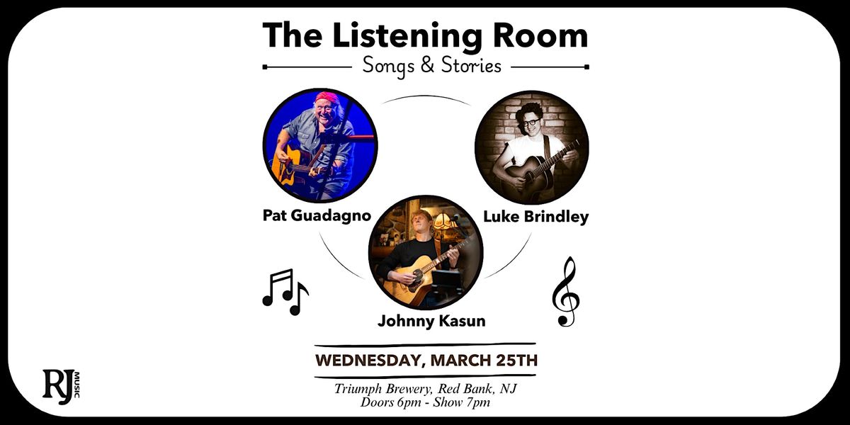 Welcome to The Listening Room: Songs & Stories and Fingerpicking Trio event happening at Triumph Restaurant & Brewery on Wednesday, March 25, 2026 at 7:00 PM. Featuring Pat Guadagno, Johnny Kasun, and Luke Brindley.