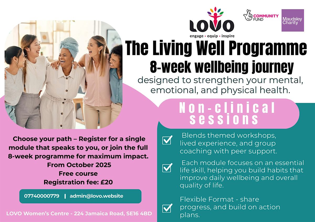 - Non-clinical sessions blending themed workshops, lived experience, group coaching, and peer support.