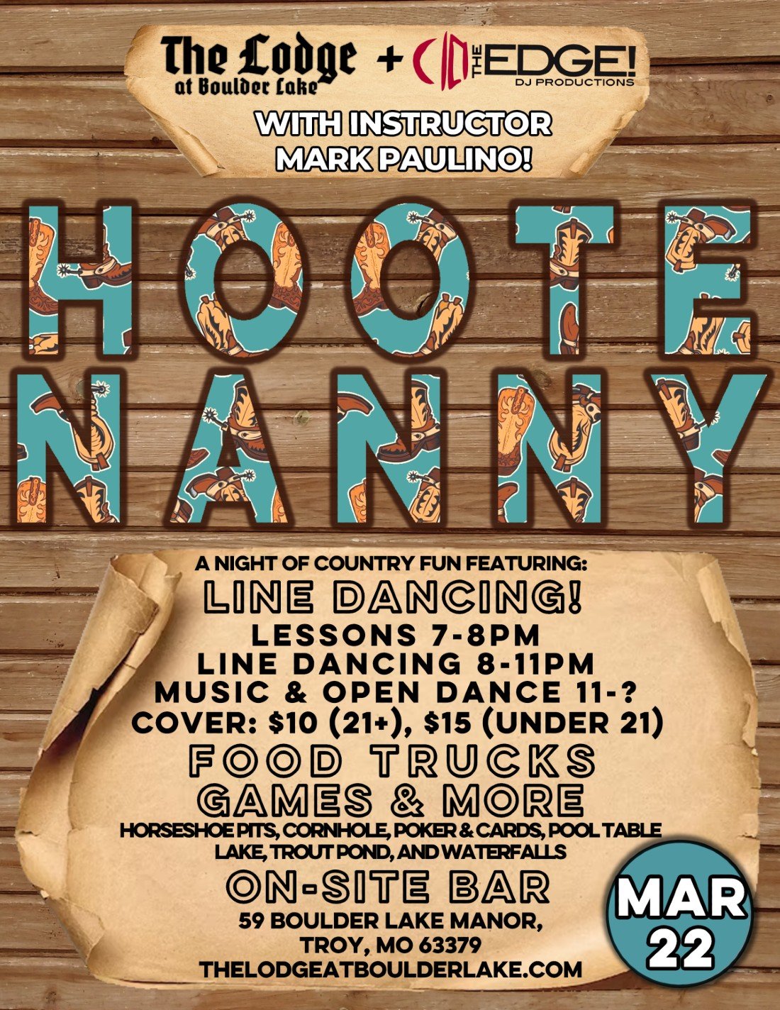 Announcing the return of the Hootenanny at The Lodge at Boulder Lake with special guest Mark Paulino from The Fine Line Dance! Featuring country line dancing lessons music & dancing Garden of Eat'n food truck and games such as cornhole horseshoe poker and pool. Our on-site bar will be available for the duration of the event. Come check us out!