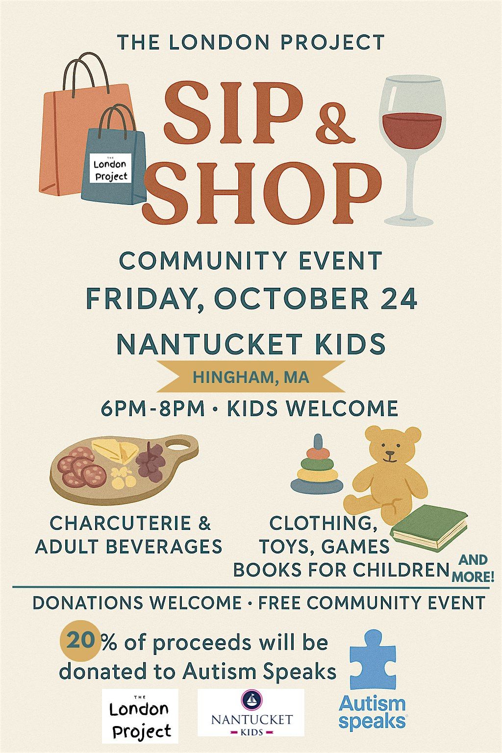 The London Project’s Sip & Shop will be held at Nantucket Kids in Hingham, MA on Friday, October 24th from 6:00–8:00 PM.