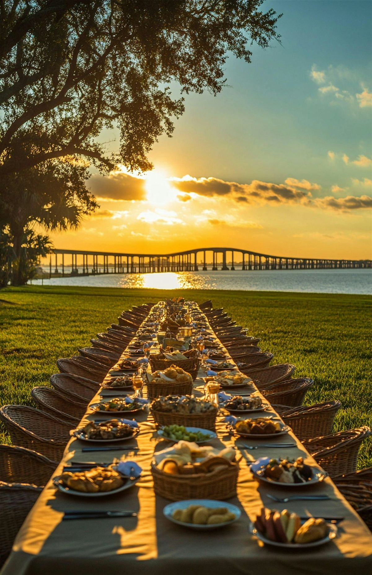 Picture this: a graceful, southern style, decorated table stretching as far as the eye can see, filled with delicious food and great company!
