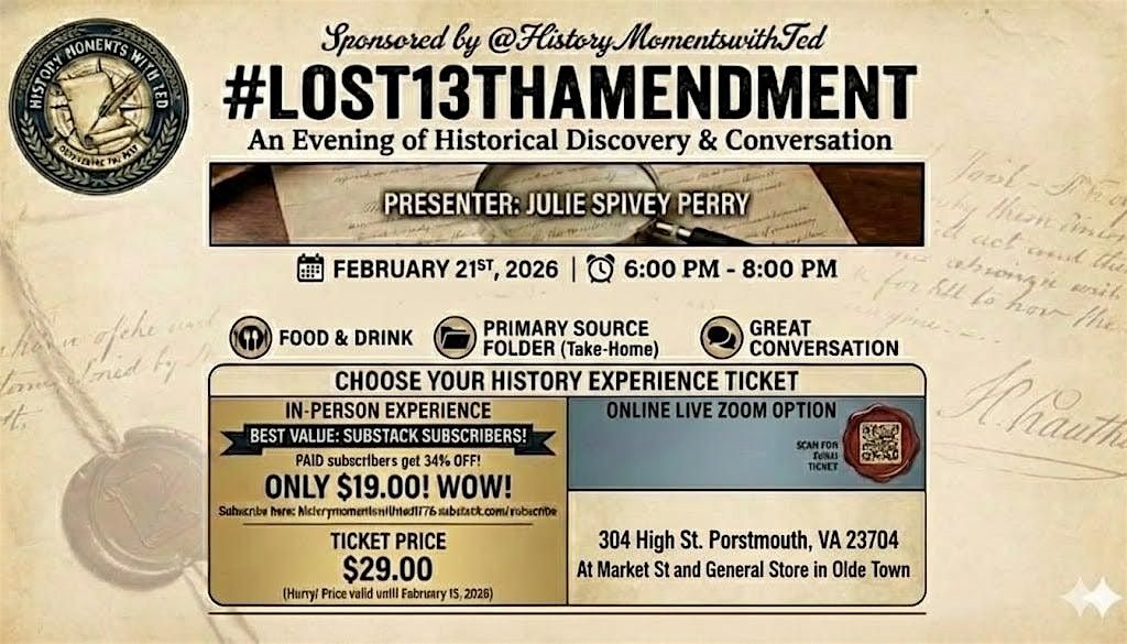 Join us in person for an eye-opening dive into the mysterious tale of the Lost 13th Amendment. This event promises a mix of fascinating history, lively discussion, and fresh perspectives on a piece of America's past that often gets overlooked. Don't miss your chance to explore and chat about this intriguing story with fellow history buffs!