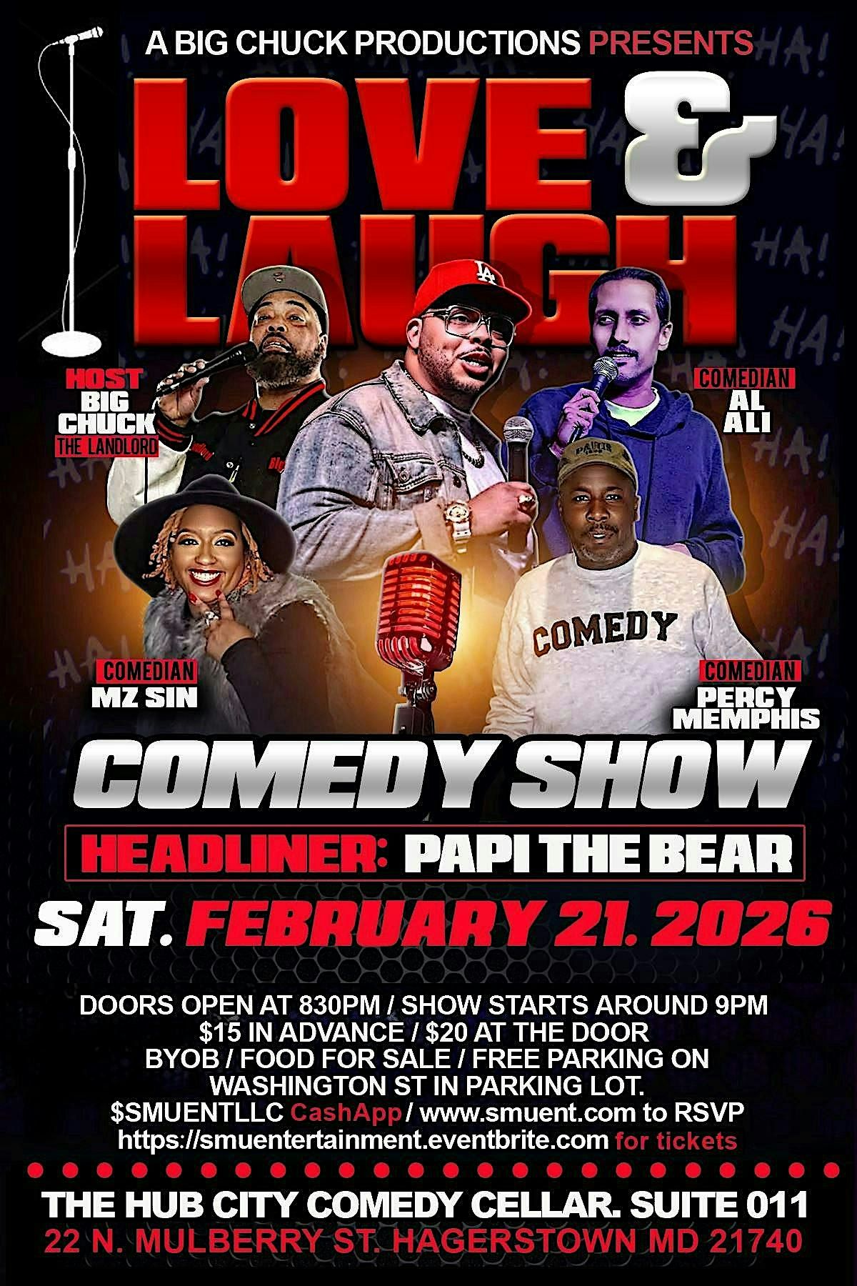 The Love and Laugh Comedy Show is a monthly stand-up comedy show hosted by Big Chuck The LandLord. It features stand-up comedians from all over the nation. February's shows Headliner is from Baltimore MD. Plus we have features and openers from Washington DC, and Mo County Md. BYOB and tickets are only $15. GREAT DATE NIGHT