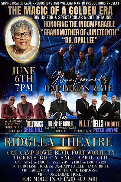 Featured VIP guests in attendance include Dr. Opal Lee (Grandmother of Juneteenth), Dr. Glyne A. Griffith II (AT&T Performing Arts Center), Yulia, James Mays, Chamaine Jeffers (CDL 4 LIFE), and Angela Buffington (Trinity River Blues Society) serving as Mistress of Ceremonies.