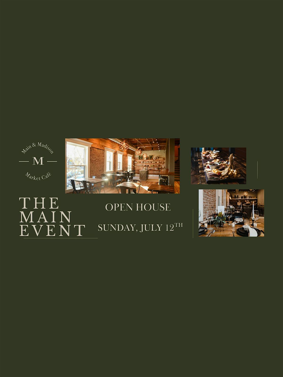 Join us for an Open House at Main & Madison on Sunday, July 12 from 3:00–6:00 PM. Explore our venue, meet the team, see some event staging, and imagine your next celebration with us. Light appetizers will be provided, and a selection of beverages will be available.