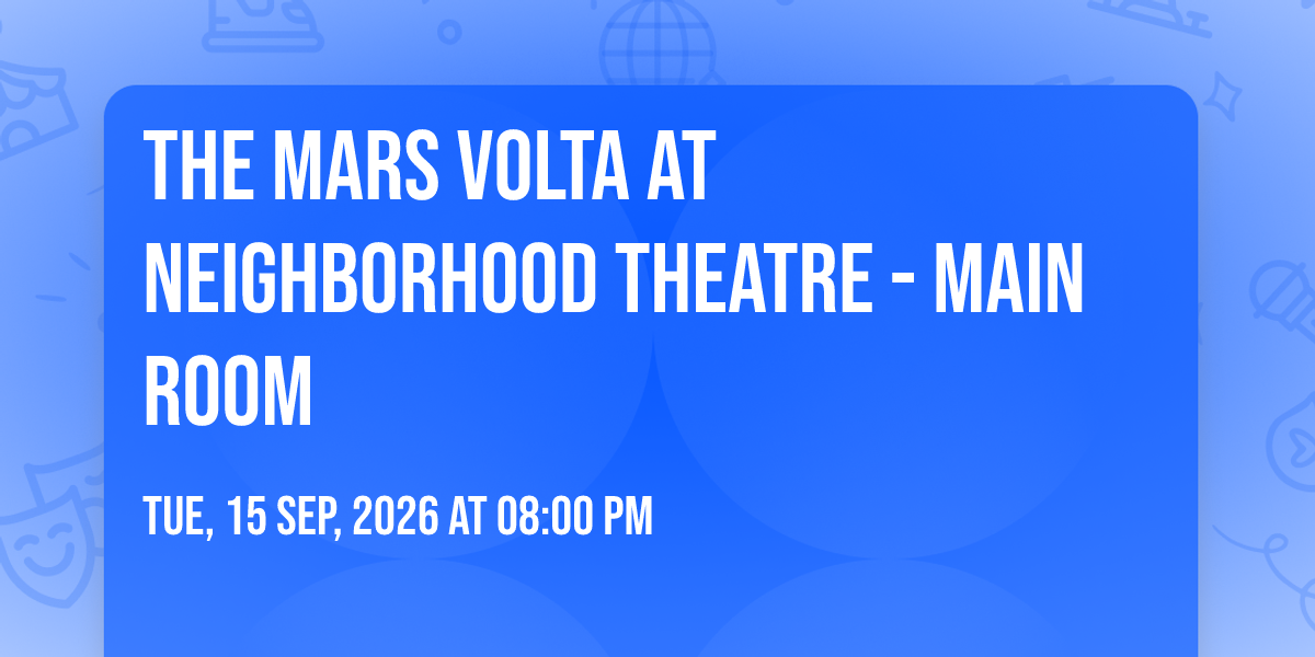 π Welcome to The Mars Volta at Neighborhood Theatre - Main Room, where dreams come alive and possibilities are endless! ποΈ Join us at Neighborhood Theatre - Main Room in the heart of Charlotte, NC for an event that defies expectations. π On September 15th, 2026 at 08:00 PM, be part of something truly extraordinary as we bring together innovation, entertainment, and pure magic. β¨ Every aspect has been carefully designed to ensure an unforgettable experience for all our guests. Whether you're seeking adventure, inspiration, or simply a break from the ordinary, this event promises to deliver beyond your wildest dreams. π Prepare for a journey into the extraordinary!