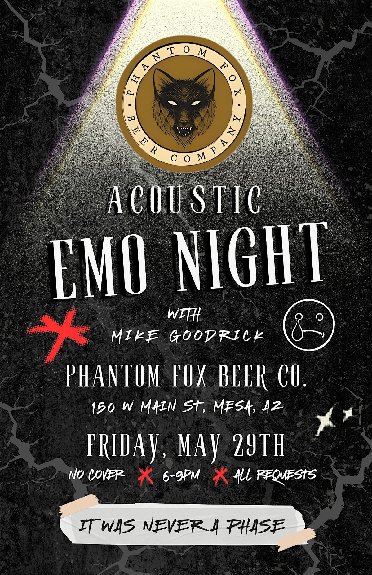 To cap off an incredible month of music, we are taking over Phantom Fox Beer Co. in Mesa. This is the grand finale of May Emo Nights. Bring your friends, grab an expertly crafted local beer, and help us blow the roof off the place with the biggest, loudest acoustic sing-along of the month.