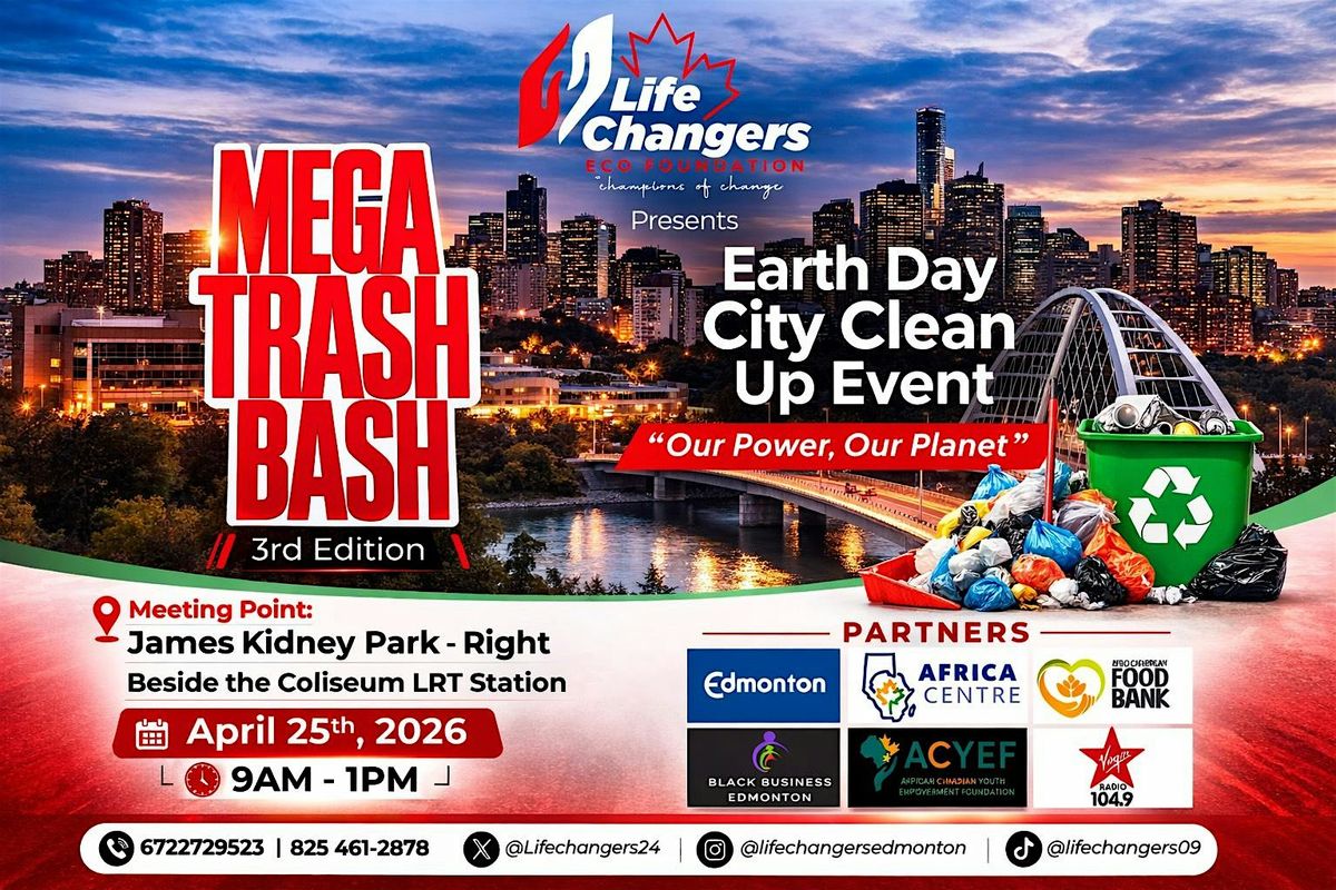 Join the Mega Trash Bash Earth Day Clean-Up! Help keep Edmonton clean, meet volunteers, earn hours & protect our planet. April 25, 9AM–1PM.