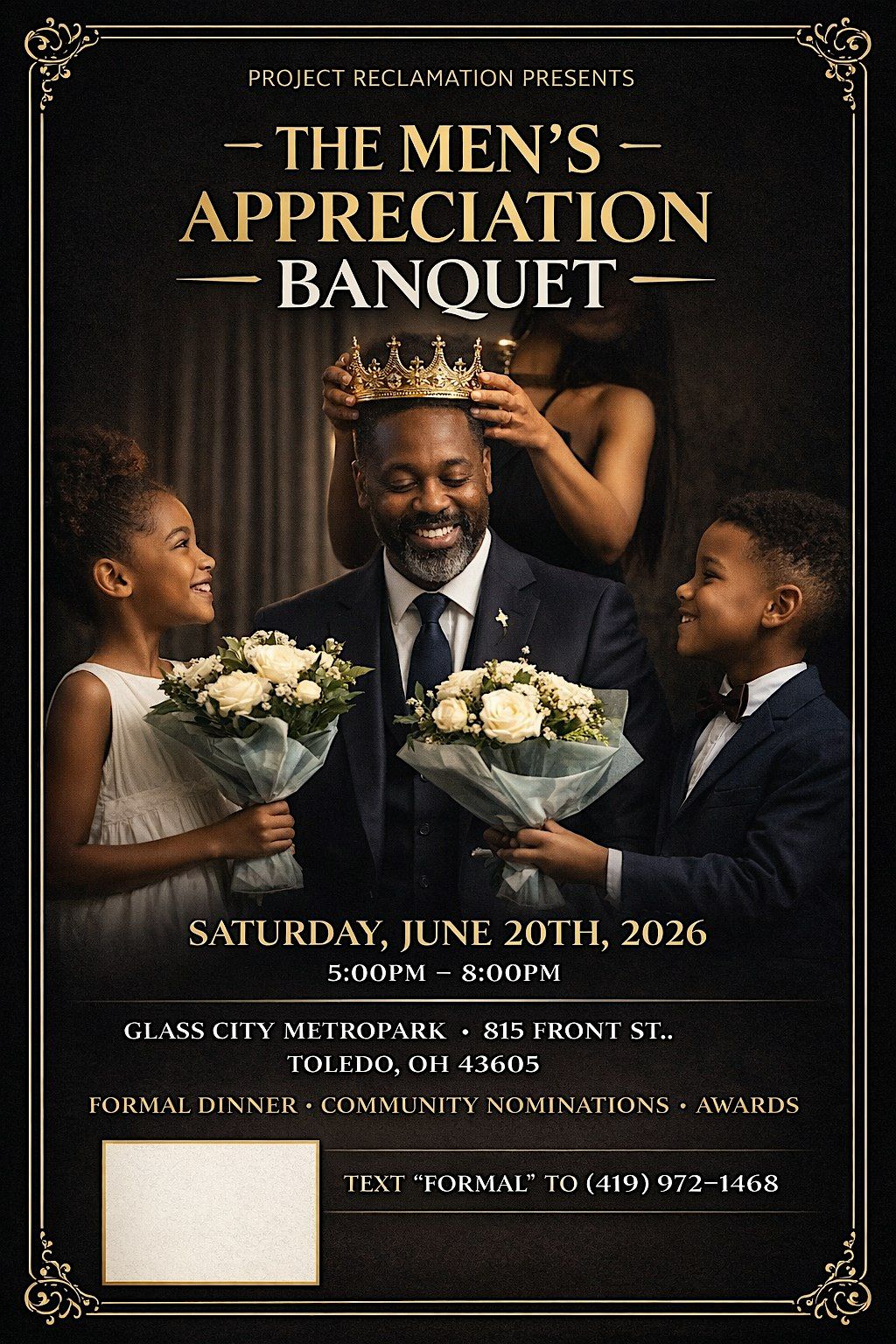 Celebrate with 50 remarkable men shaping families and communities at this formal, in-person evening. Enjoy a delicious dinner, heartfelt recognition, and the crowning of our major honorees fuled by community nominations. Whether you attend, nominate a man, or support the mission, your presence helps honor impact and advance Project Reclamation’s work. Don’t miss this inspiring night of stories, recognition, and community!