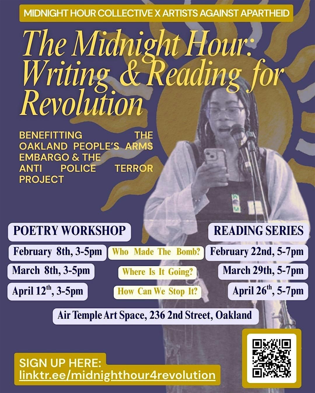 Artists Against Apartheid & The Midnight Hour Collective present: a poetry reading series centered on domestic and global liberation. Come gather in community to read and listen to poetry centering Black liberation and the liberation of Palestine, Sudan, the Congo, and an end to American militarism.
