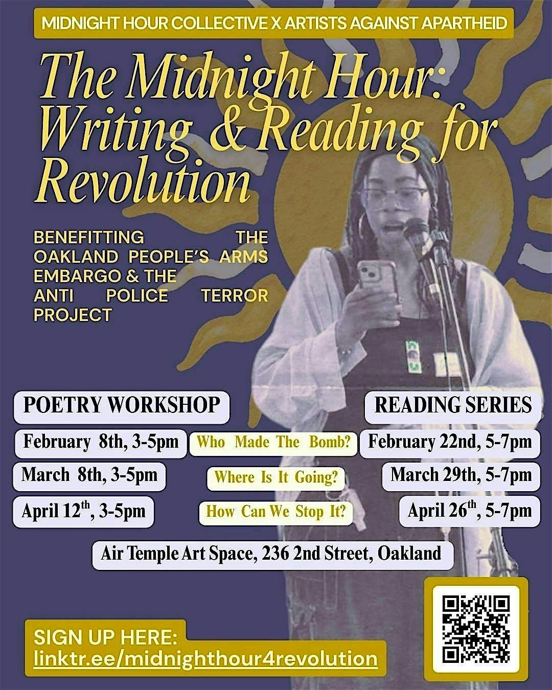 This workshop is free to attend. Poets are encouraged but not required to read their work at The Midnight Hour: Reading for Revolution, a related, pay-what-you-can reading series. All proceeds for Series 1 go to the Oakland People's Arms Embargo & Anti-Police Terror Project.