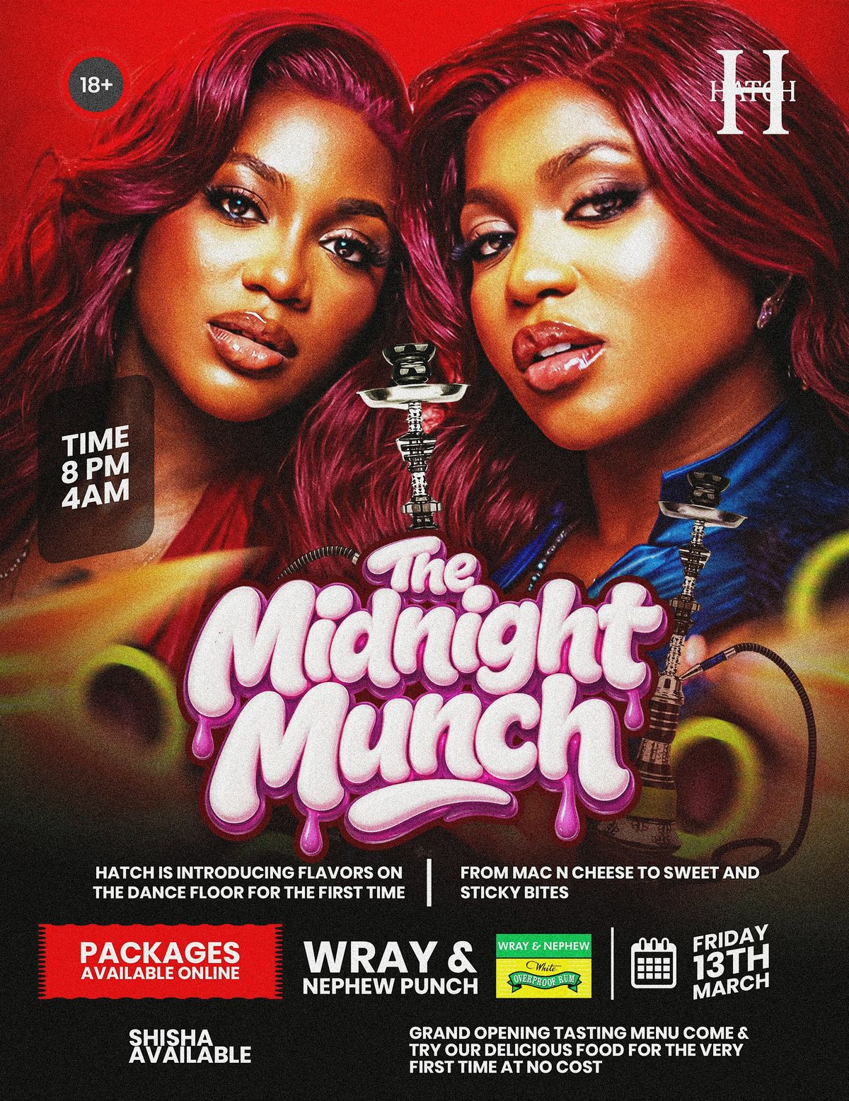 The Midnight Munch at Hatch – where late-night vibes meet great food. Enjoy a free tasting menu, Wray & Nephew punch, music, and shisha.About this Event