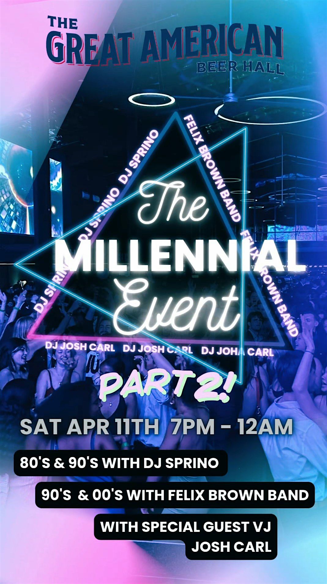 Get ready for a wicked awesome interactive experience packed with fun and all the vibes you love. The Millennial Event Pt 2 is is back with the same legendary lineup and a few extra surprises. Sip your way through the 80's 90's and 2000's with the ultimate millennial throwback music event.