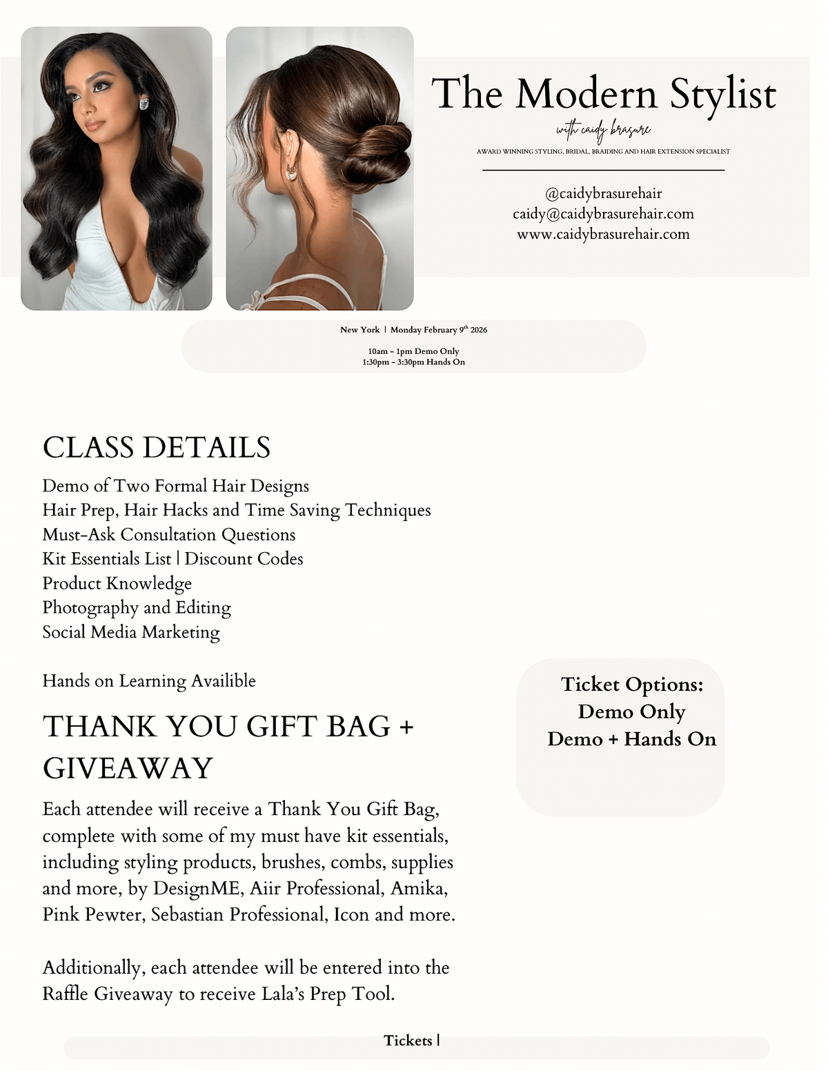 Each attendee will receive a Thank You Gift Bag, complete with some of my must have kit essentials, including styling products, brushes, combs and supplies by DesignMe, Amika, Pink Pewter, Sebastian Professional, Aiir Professional, Icon and more.