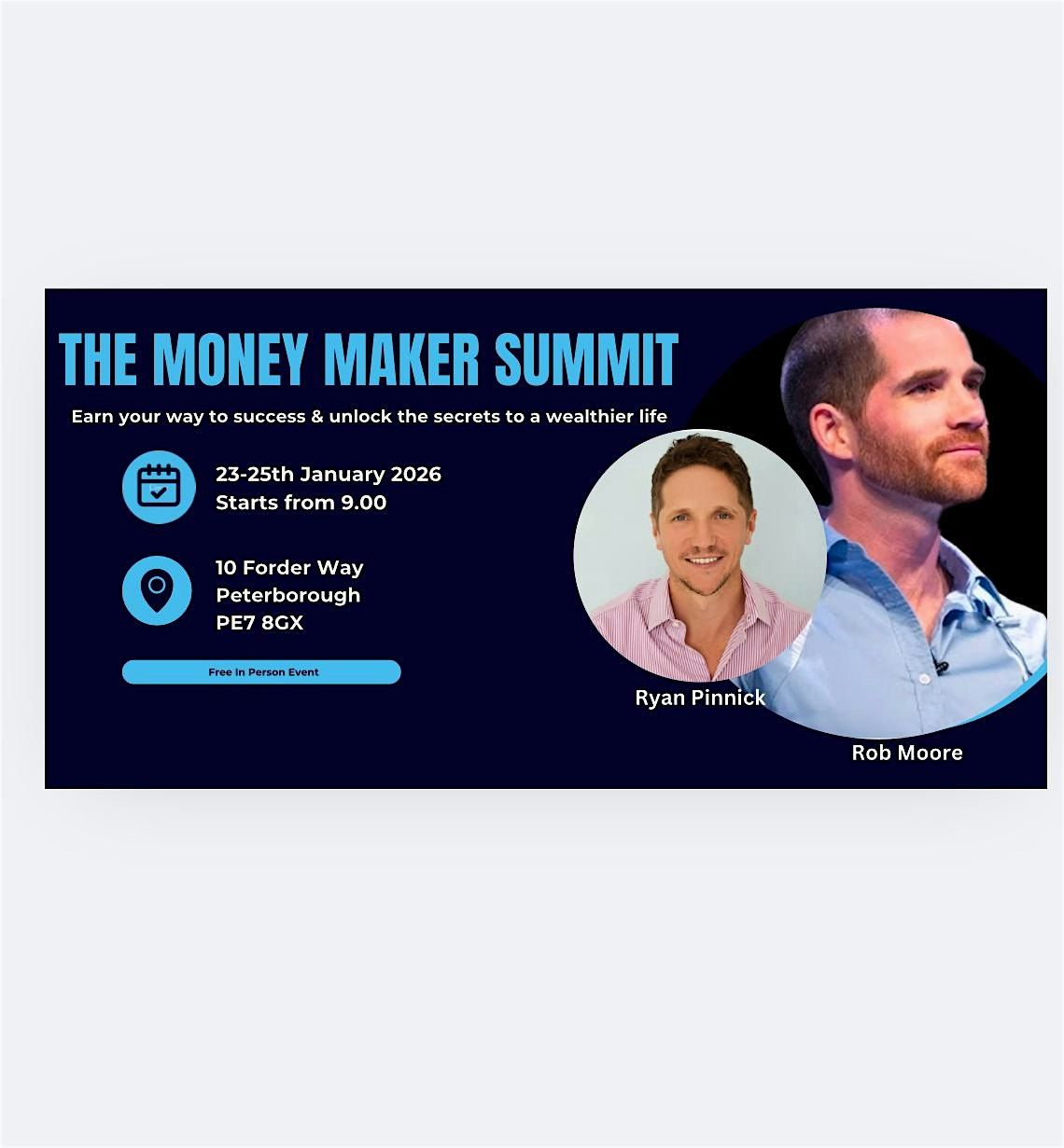 Join us for the Money Maker Summit on Friday 23rd - Sunday 25th January 2026 , starting at 08:30 AM GMT. This in-person event will take place at the Progressive HQ, 10 Forder Way, Peterborough, PE7 8GX.