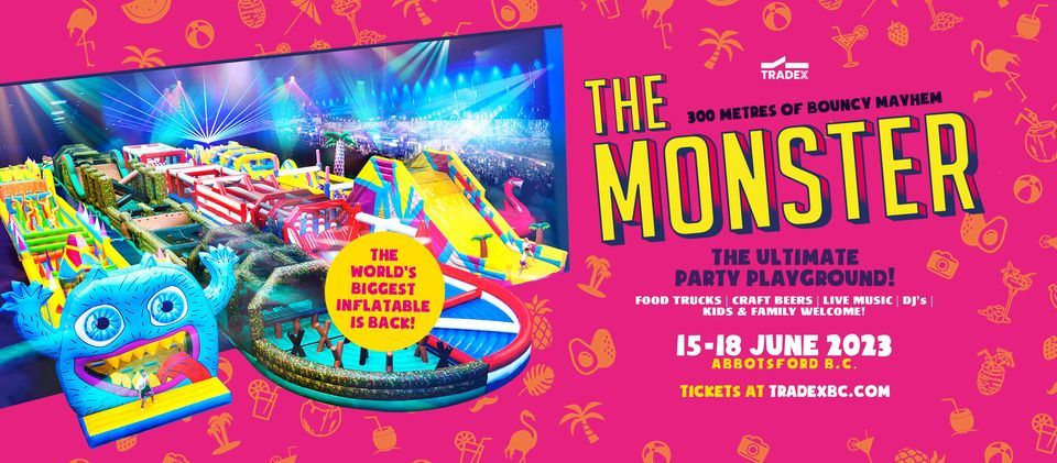 The world's biggest inflatable obstacle course comes to Abbotsford at the Tradex June 15-18th. At 300 meters long, The Monster is the world's largest inflatable obstacle course and it's bigger, better, bouncier and more bonkers than ever before! This really is the ultimate party playground, happening live across Canada, with sessions for kids, families and adults!Expect bars and street food, live music and DJ's, Crazy Games, and the most ridiculously fun day out you could possibly imagine!
