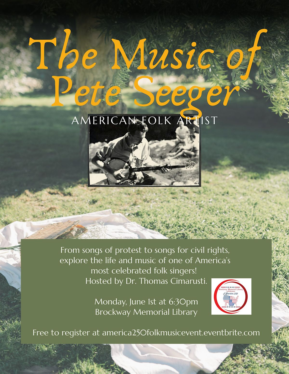 As part of Brockway Memorial Library's "America 250" lineup, this program will look at the life and music of singer, songwriter, and social activist Pete Seeger.