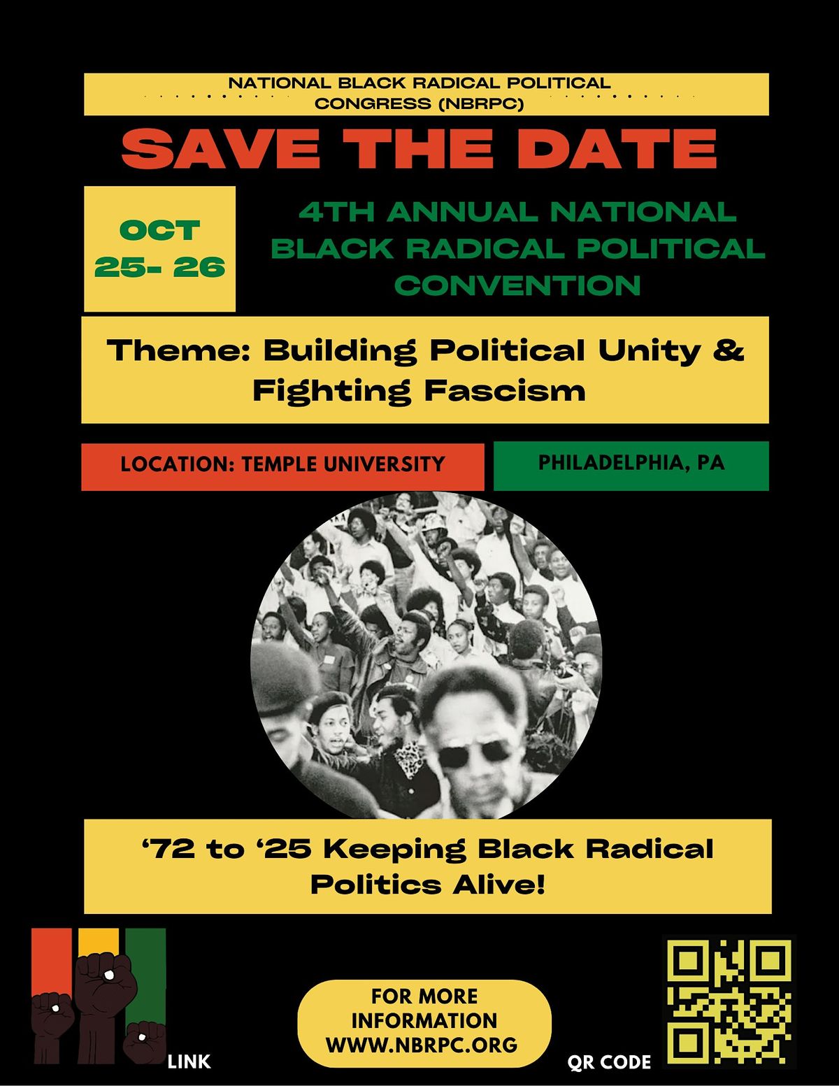 Welcome to the National Black Radical Political Convention (2025) happening at Temple University on October 25-26th 2025 at 9:00 AM (Eastern Time). Join us for days filled with powerful discussions, inspiring speakers, and meaningful connections. This event is a platform for us to come together, share ideas and work towards broad-based, principled political unity. It is imperative that we do so as Black people locally, nationally and globally continue to face continuous threats to our humanity and existence. We meet in honor of the heroic efforts of those voices from the 1972 National Black Political Convention who advocated for independent Black politics, self- determination, reparations, Pan-Africanism and solidarity with the Palestinians.