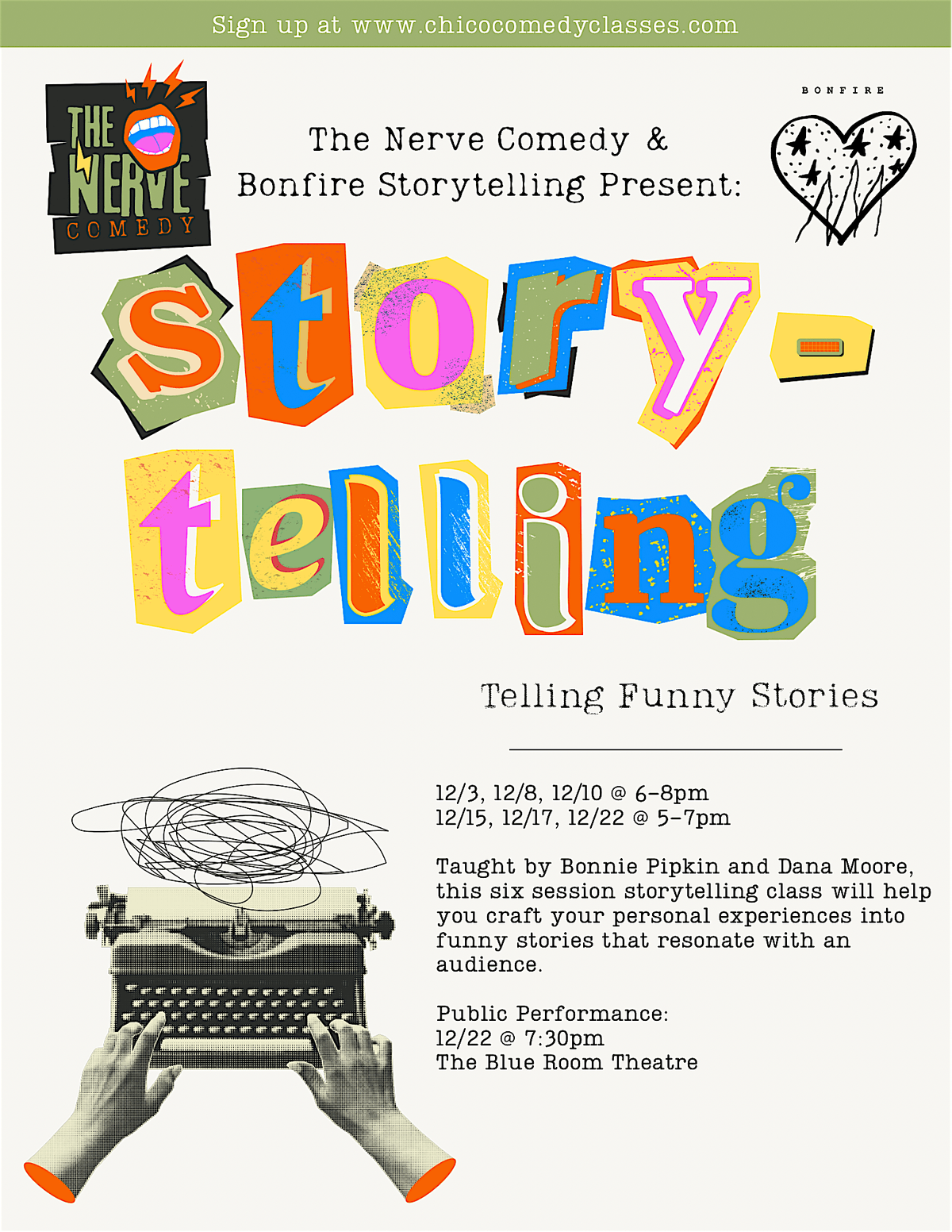 TELLING FUNNY STORIES is a workshop led by Dana Moore (The Nerve Comedy) & Bonnie Pipkin (Bonfire Storytelling). In a series of 6 sessions, participants craft their funny story and take it to the stage.