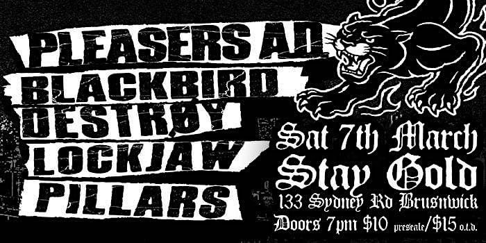 Pleasers A.D, Blackbird, Destroy, Lockjaw, and Pillars have come together to showcase the changing sound of our city's hardcore scene.About this Event