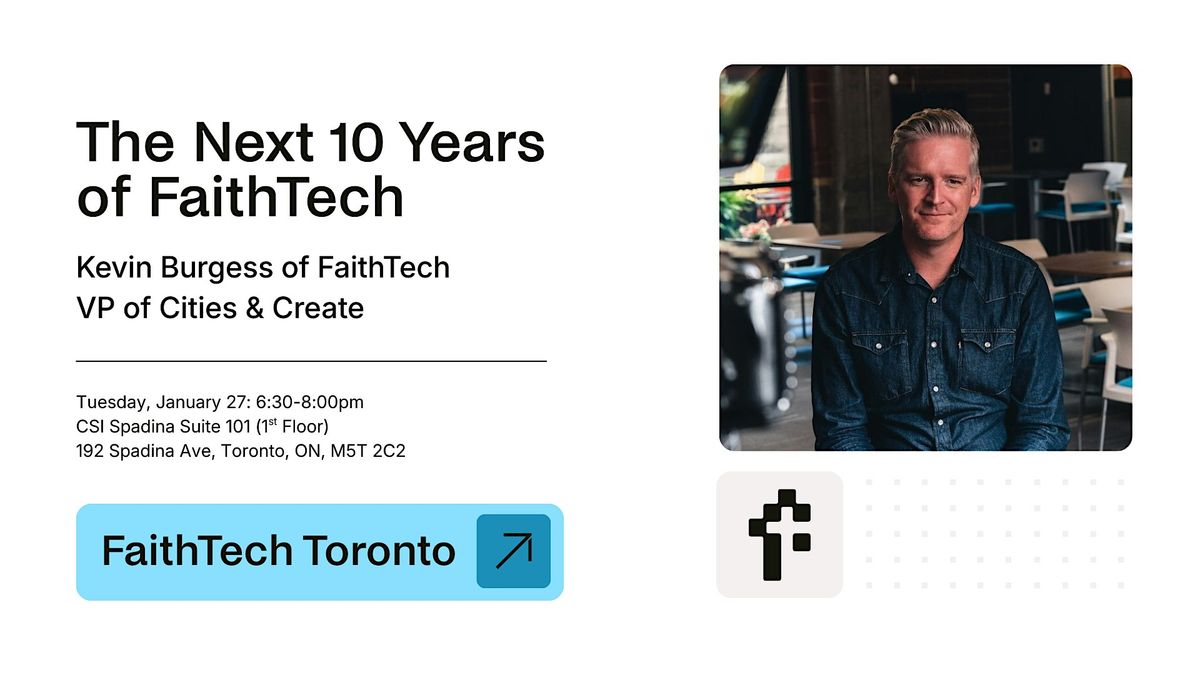Join us for an exciting dive into what the future holds for FaithTech! Kevin Burgess is gearing up to share insights, trends, and his vision for the next decade of innovation at the intersection of faith and technology. Whether you're a tech enthusiast, faith leader, or just curious, this event promises to inspire and spark fresh ideas. We invite you to be part of our growing community and experience how God is moving through faith and technology in Toronto!