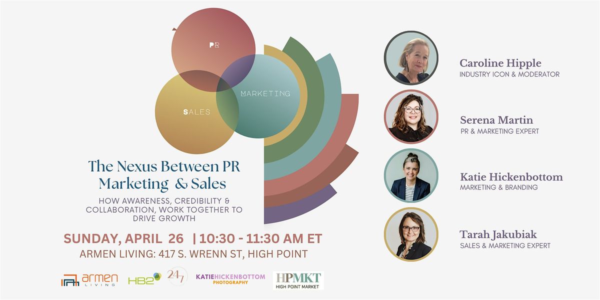 “The Nexus Between PR, Marketing, & Sales; How Awareness, Credibility & Collaboration Work Together to Drive Growth,” will be held on Sunday, April 26th, from 10:30-11:30 am at Armen Living's new showroom: 417 S. Wrenn St in downtown High Point.