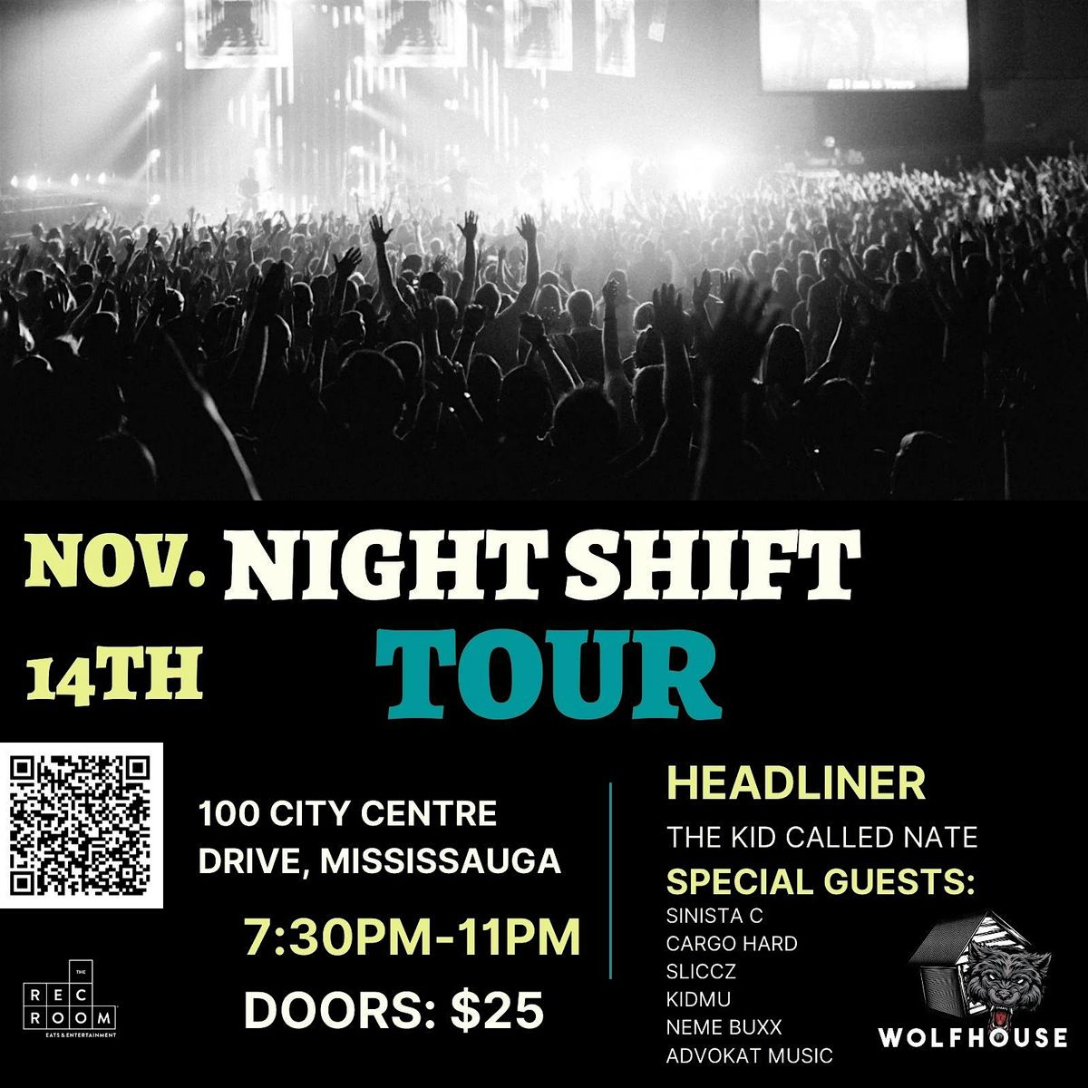 The Night Shift Tour – Mississauga 🚨On November 14th, 2025, The Rec Room @ Square One will be the place to be as The Kid Called NATE — Canada’s rising hip-hop force & founder of Wolf House Entertainment — headlines an electrifying night of music.