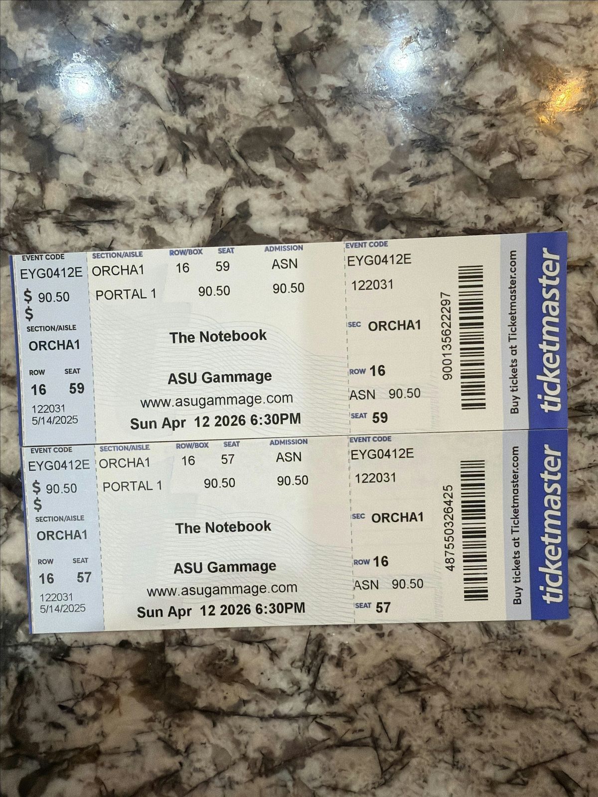 The Notebook play! My Daughter and I unfortunately are unable to attend anymore. Selling 2 tickets for $160 (original $180)