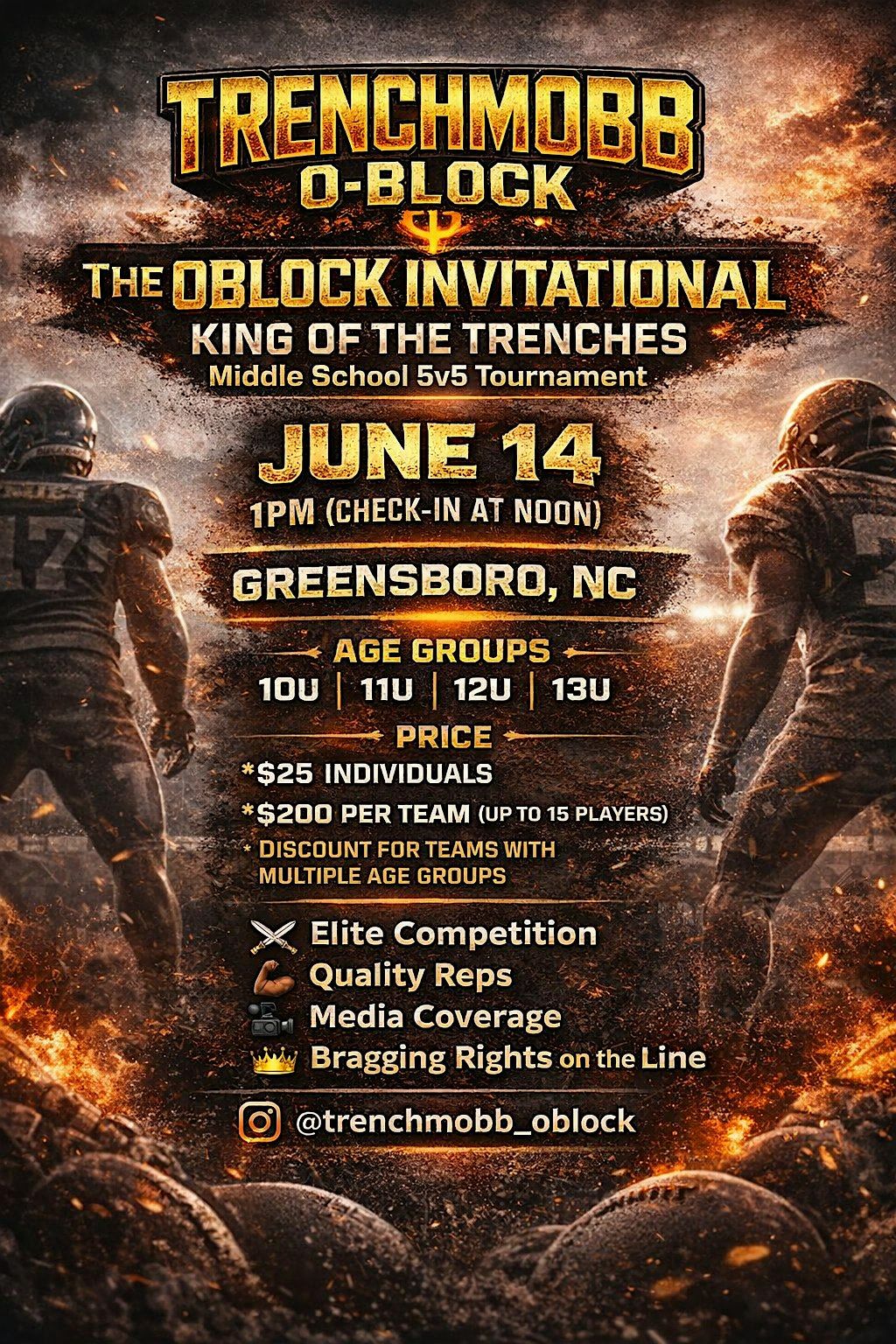 This is where BIG MEN take center stage!The OBLOCK Invitational is a one-of-a-kind 5v5 trenches tournament built specifically for offensive and defensive linemen to compete, develop, and dominate. No skill positions. No distractions. Just real quality reps in the trenches.Athletes will get: