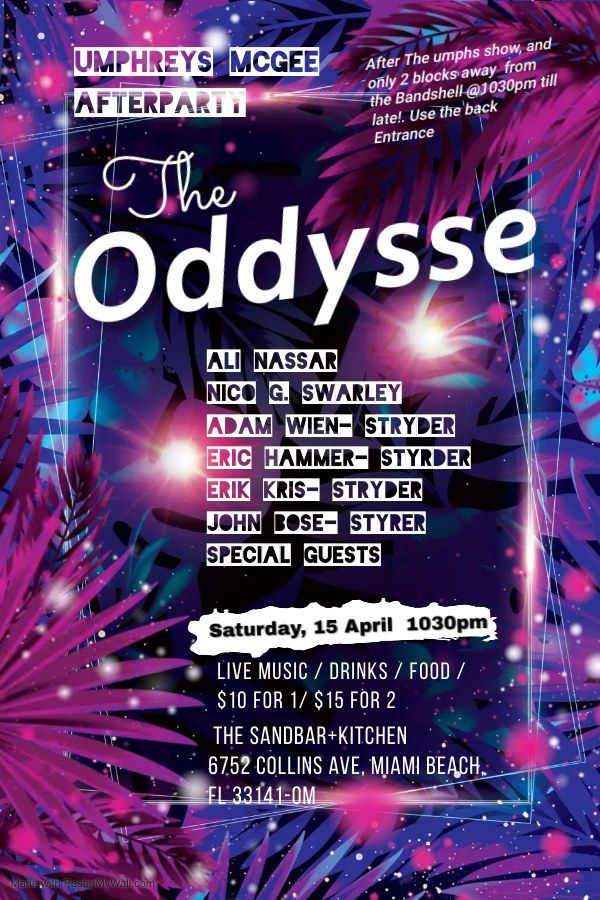 The ODDYSEE: a Umphreys Mcgee AfterpartyA quick 2 block hop stitch and pass to the venue. After Umphs lets out from the Bandshell, we will be rippin the night away, Who knows who will show up on this Oddysse!!