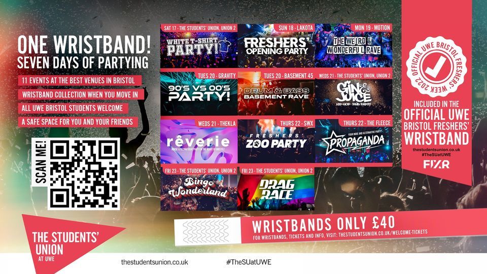 ???? ?????, ?????????? ???, ?????? ??????, ??? ??? ???????, ?? ??? ??'? ???? ??????? ????! Freshers... Welcome to Bristol!? ?? unique events, across ? of Bristol's best venues, with ? unforgettable week of partying?Grab your official UWE Freshers' Wristband NOW and guarantee yourself the perfect start to the uni experience ? See you in dance from Saturday 17th September for a week of madness ??