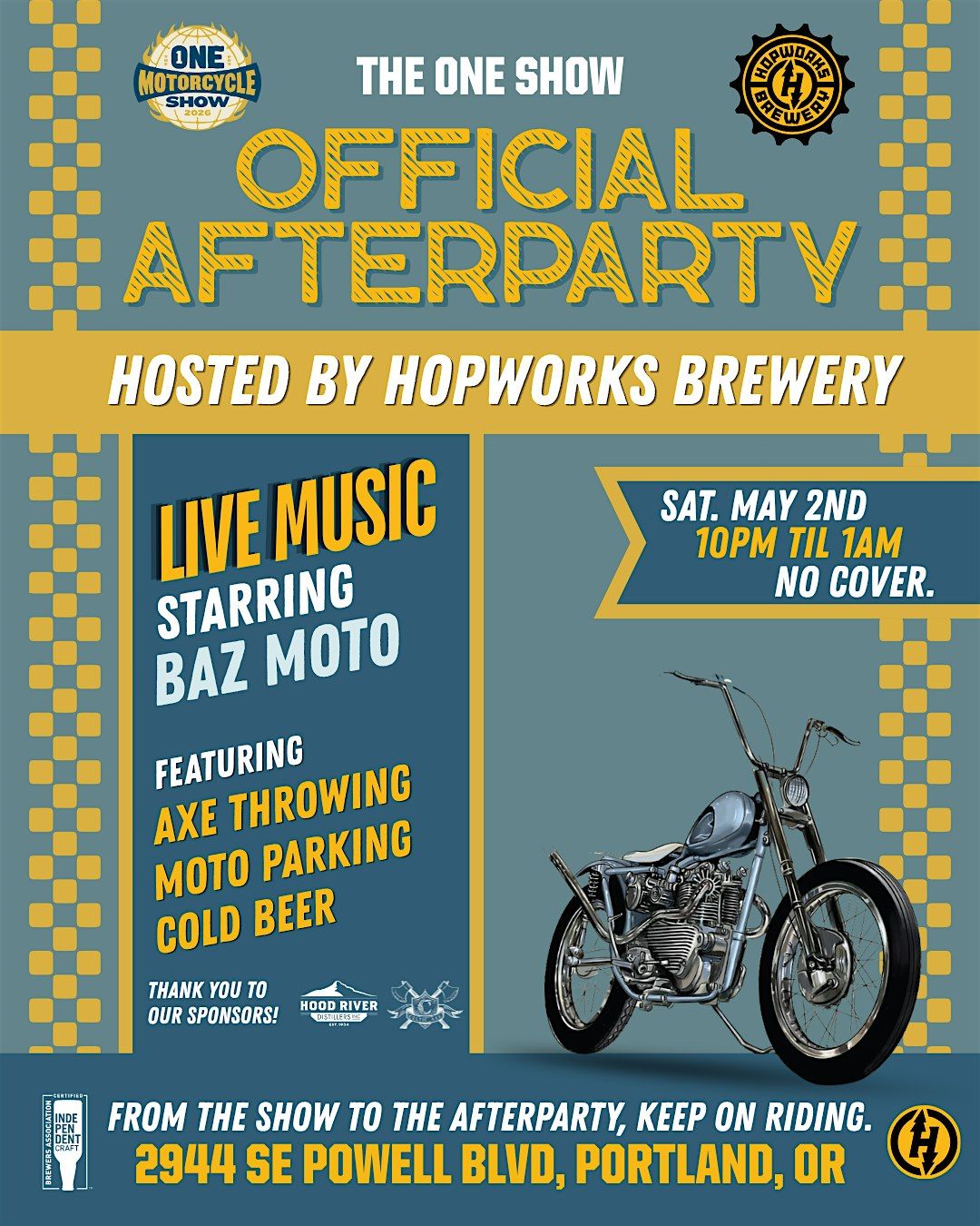 When the show wraps up, the night keeps rolling at Hopworks Brewery, the official afterparty destination for the One Moto Show. Join us for a late‑night celebration filled with live music, cold beer, and moto‑friendly vibes.