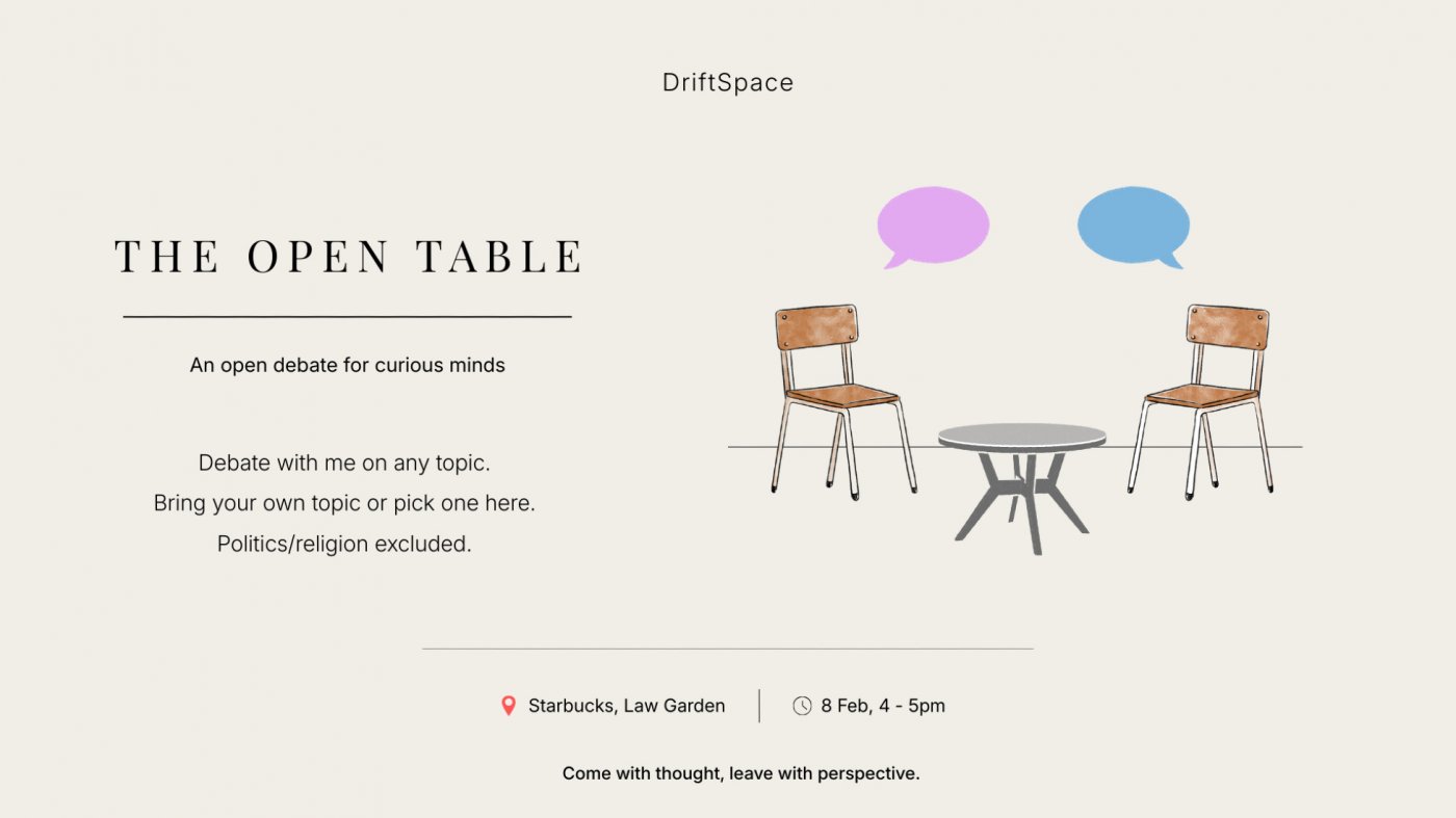 It’s a friendly space where ideas are explored. You can bring a thought you believe in, question one you’re unsure about, and learn. Disagreeing is welcome, disrespect isn’t.