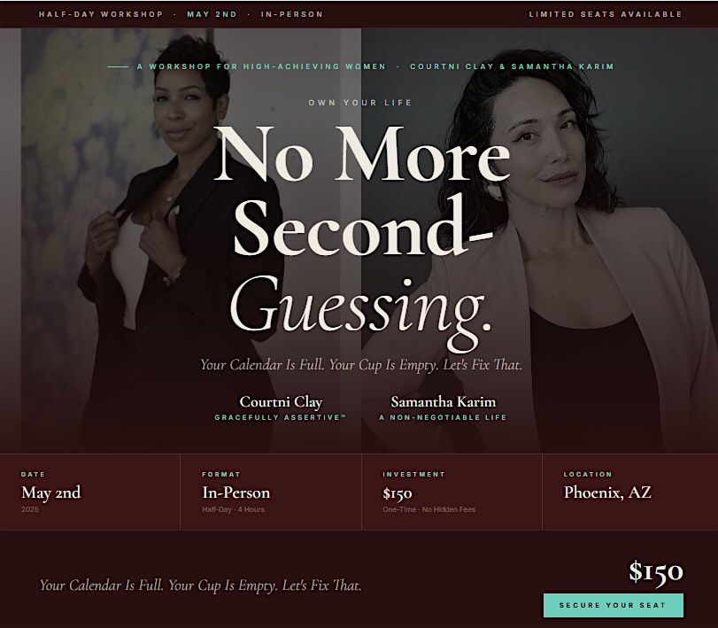 Own Your Life is a half-day in-person workshop for high-achieving women who are done second-guessing — and ready to lead with authority, protect their time, and finally stop choosing between being effective and being at peace.