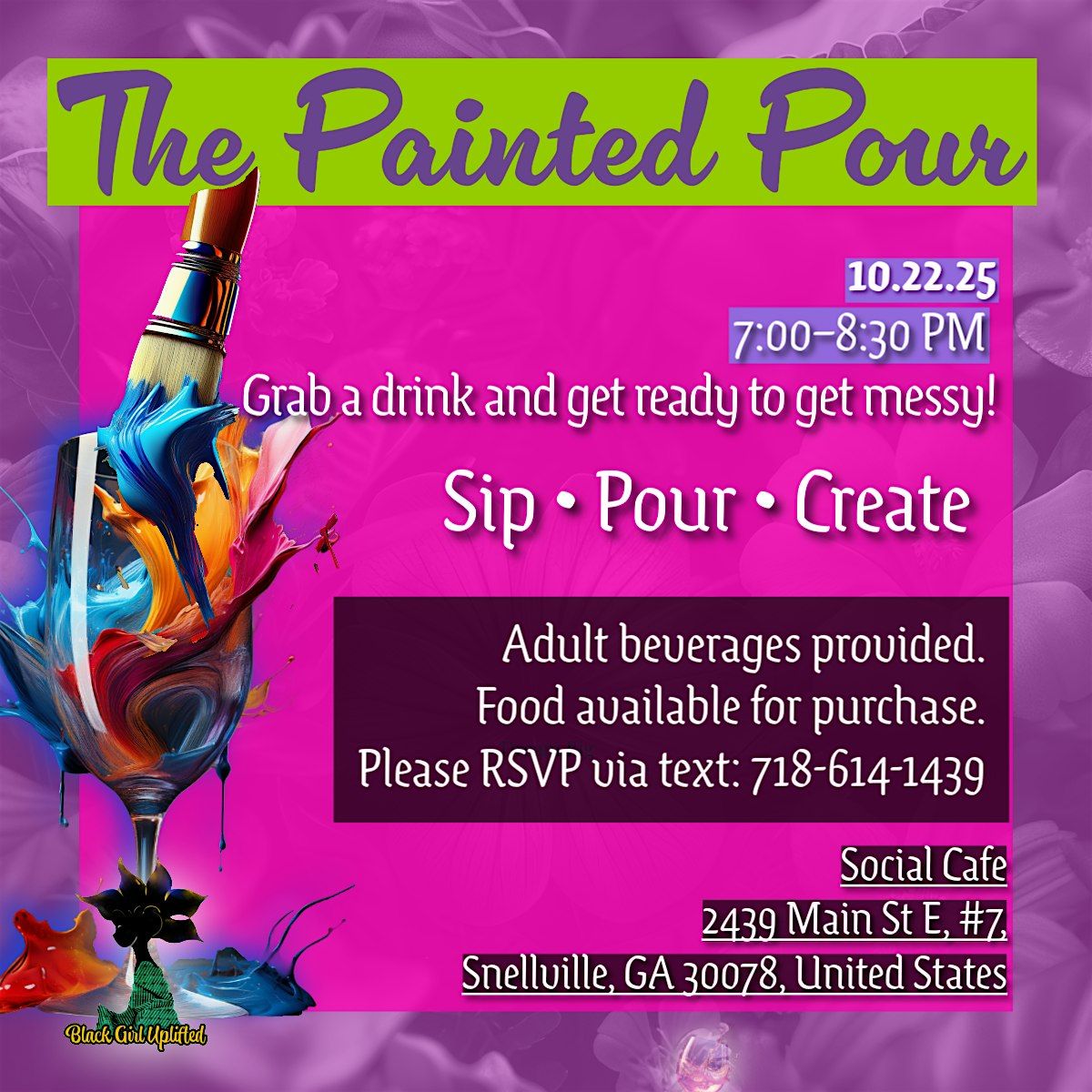 Grab a drink and get messy! The Painted Pour is a sip‑and‑paint with a twist — pour painting, good vibes, and complimentary adult beverages.