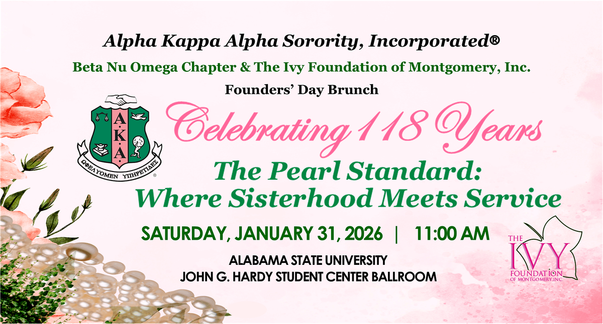 The Beta Nu Omega Chapter in partnership with the Ivy Foundation of Montgomery, Inc. cordially invites you to join us in celebrating the 118th Founders’ Day Celebration of Alpha Kappa Alpha Sorority, Incorporated®.