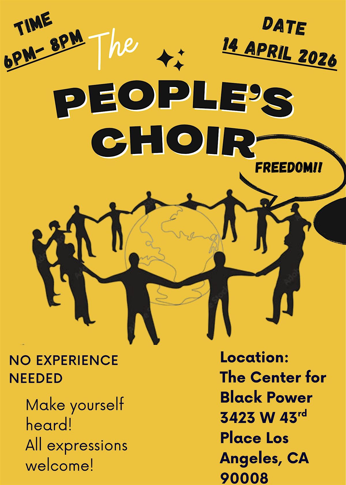 The People's Choir is not as much a choir as much as it is sites of possibility, creation, collaboration, coordination, experimentation, and explication. Bring your gifts and abilities whatever they may be. Be it music, dance, spoken word, movement, fashion, art, or song. Whatever you feel you can add to the movement for collective liberation for ALL. Bring it. While you're at it bring willingness as well! We welcome all bodies, across all genders or lack there of, all sexualities and all expressions. Come and share your expression(physical or metaphoric VOICE). Our collaboration will feature conversation, sonic experimentation, movement, chants, call and response, and a sense of concentrated play/ joy as forms of resistance. How do we create space? Come willing, curious, and with imagination as we propagate something truly special. This is a developing approach and in service of the movement.