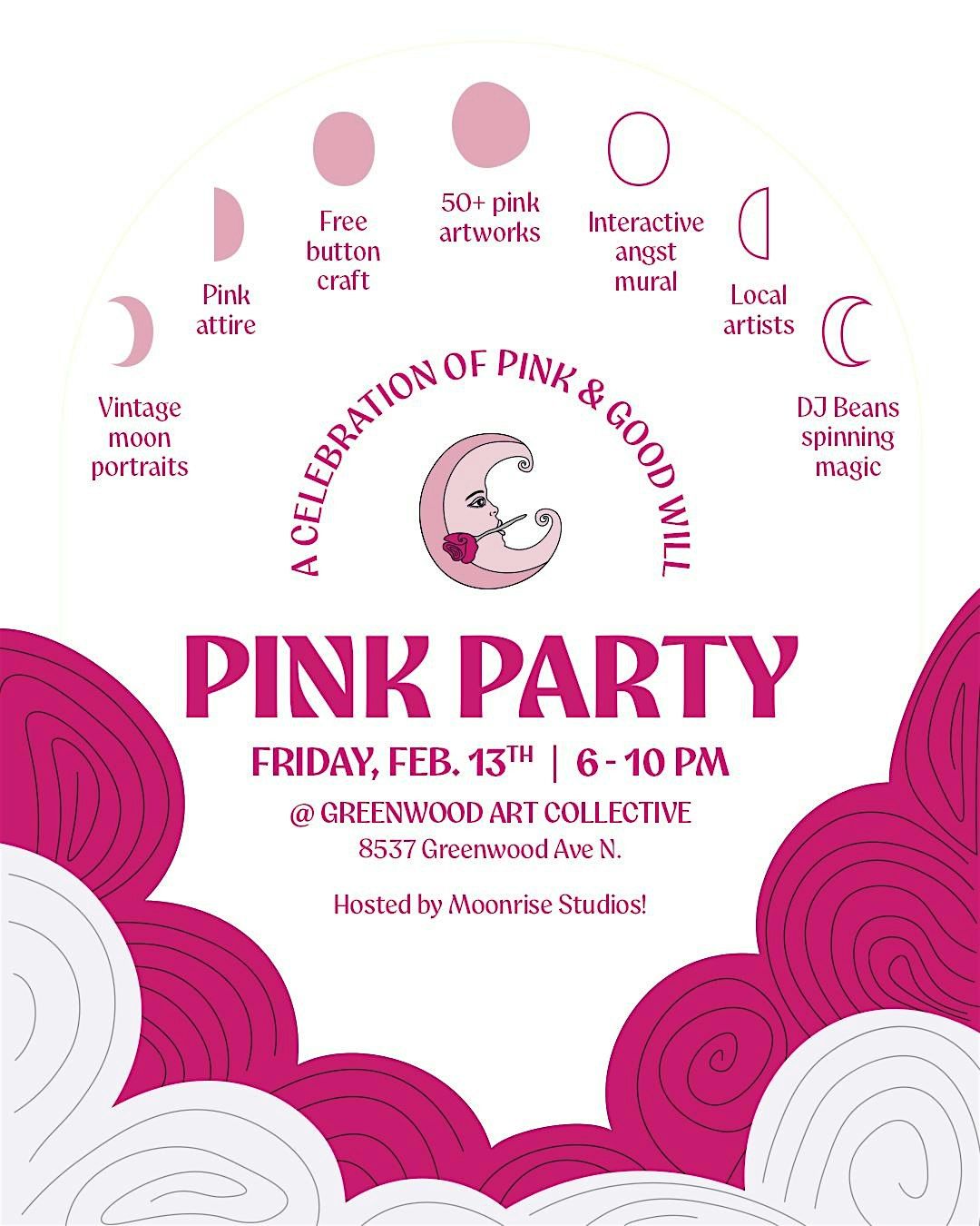 If you have pink art you’d like included in the show, let us know by Sunday, Feb 4, 2026 via linktr.ee/moonrise.studios.seattle