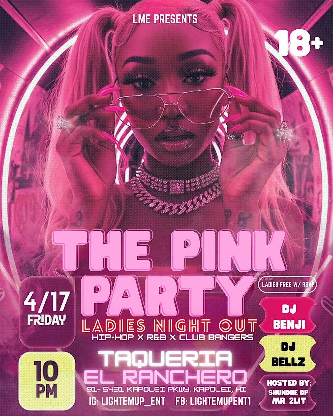 Pop out for a night of lit vibes at Taqueria El Ranchero! On 04/17 pop out pink, let loose, and enjoy a night out with your girls. Whether celebrating a special occasion or just looking for a good time, we going up with club bangers, drinks, and lit vibes all night! Be ready to dance, pour up, and create unforgettable vibes. Grab your squad and get ready to show off your worst behavior dressed to impress in pink!