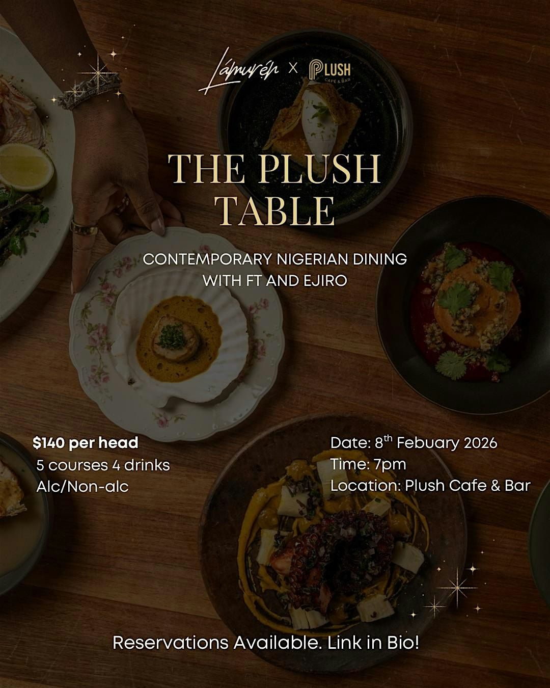 Hosted at Plush Cafe, this curated evening invites guests to explore Nigerian flavours reimagined through a multi-course tasting menu accompanied by signature cocktails and non-alcoholic options, designed to complement each dish.
