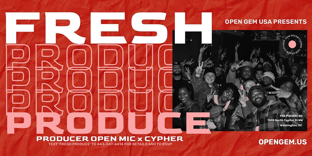 Fresh Produce, an open mic for producers, at The Pocket DC. The event is designed for producers to showcase their talent. Producers are allowed a 2 Beat set (5 min. max.) and have the option of letting a few MC's in the building flex their freestyle skills. Sign up starts at 6pm, producers will perform in chronological order.