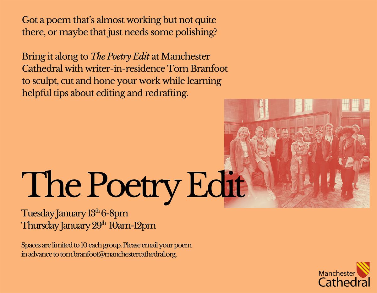 Bring it along to The Poetry Edit at Manchester Cathedral with writer-in-residence Tom Branfoot to sculpt, cut and hone your work while learning helpful tips about editing and redrafting.