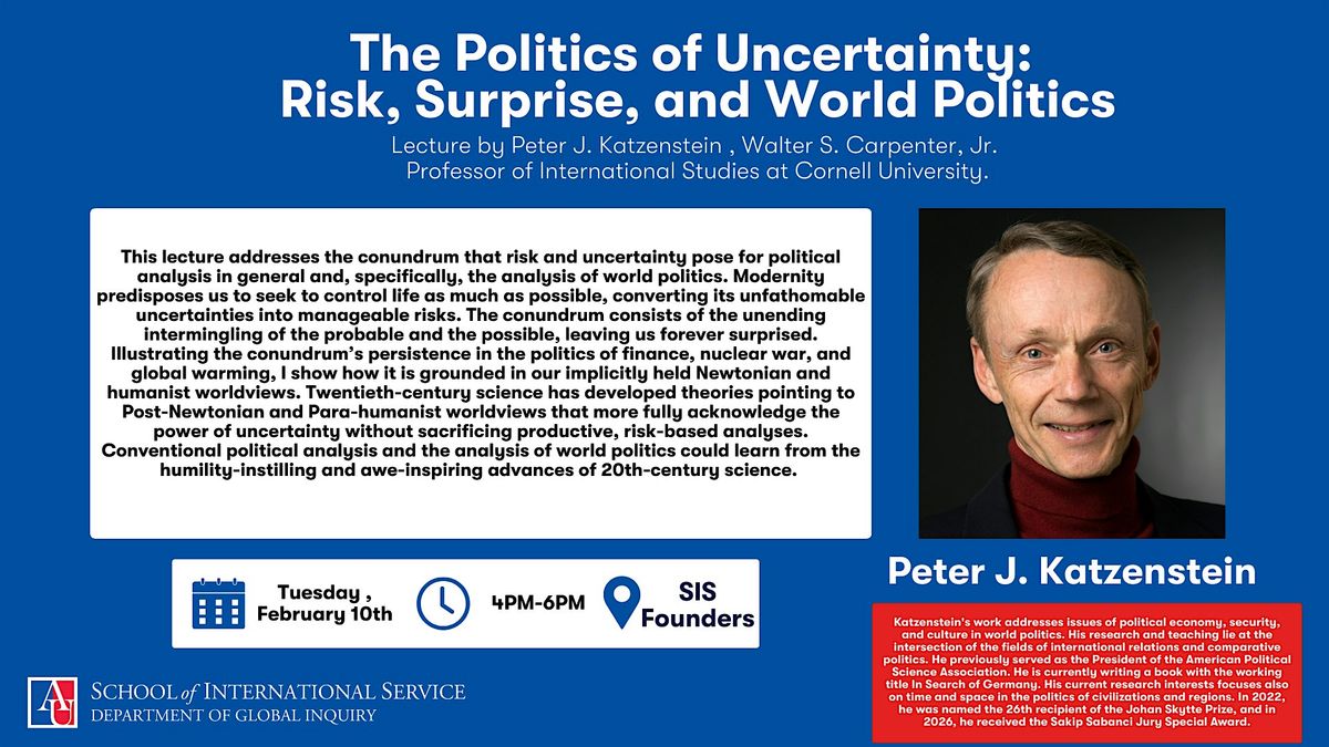 This lecture addresses the conundrum that risk and uncertainty pose for political analysis in general and, specifically, the analysis of world politics. Modernity predisposes us to seek to control life as much as possible, converting its unfathomable uncertainties into manageable risks. The conundrum consists of the unending intermingling of the probable and the possible, leaving us forever surprised. Illustrating the conundrum’s persistence in the politics of finance, nuclear war, and global warming, I show how it is grounded in our implicitly held Newtonian and humanist worldviews. Twentieth-century science has developed theories pointing to Post-Newtonian and Para-humanist worldviews that more fully acknowledge the power of uncertainty without sacrificing productive, risk-based analyses. Conventional political analysis and the analysis of world politics could learn from the humility-instilling advances of 20th century sciences.