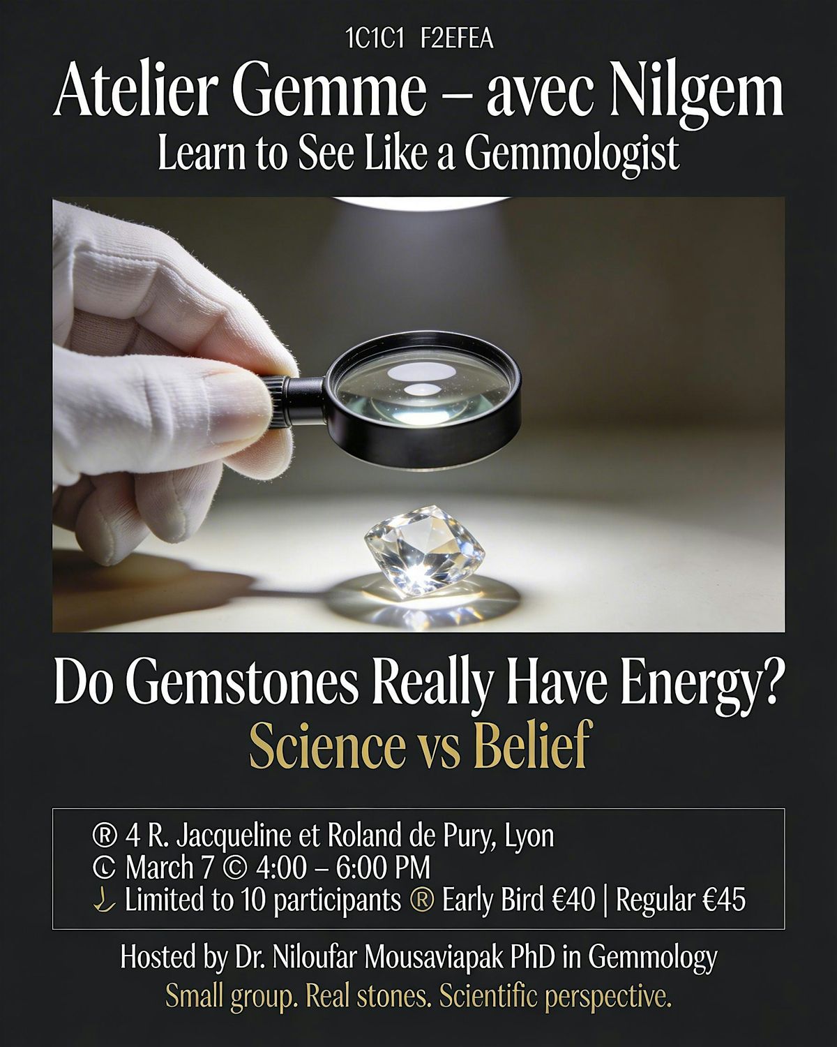 Join Atelier Gemme – avec Nilgem, an interactive 2-hour workshop led by a PhD in Gemmology.